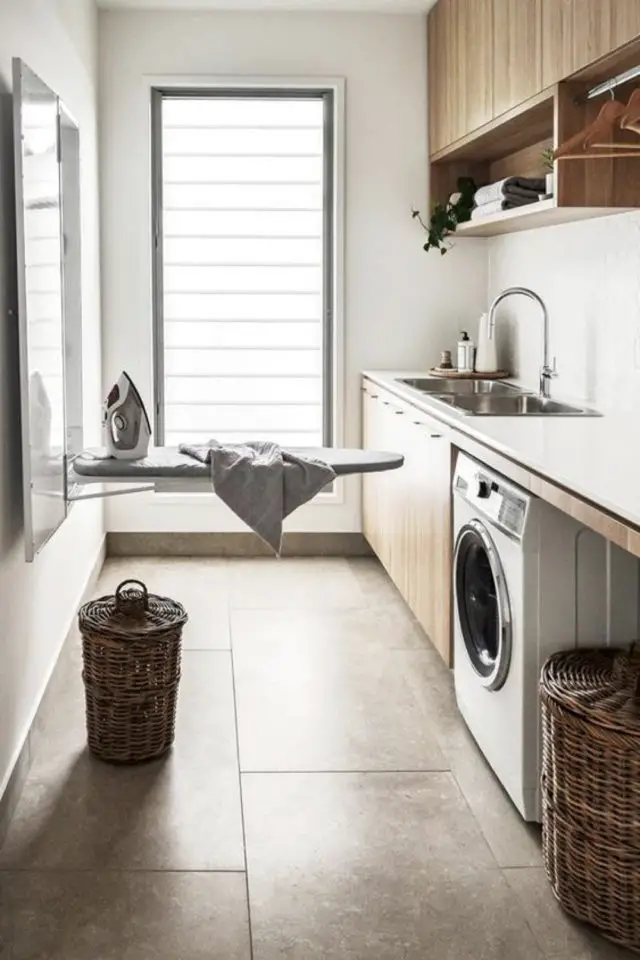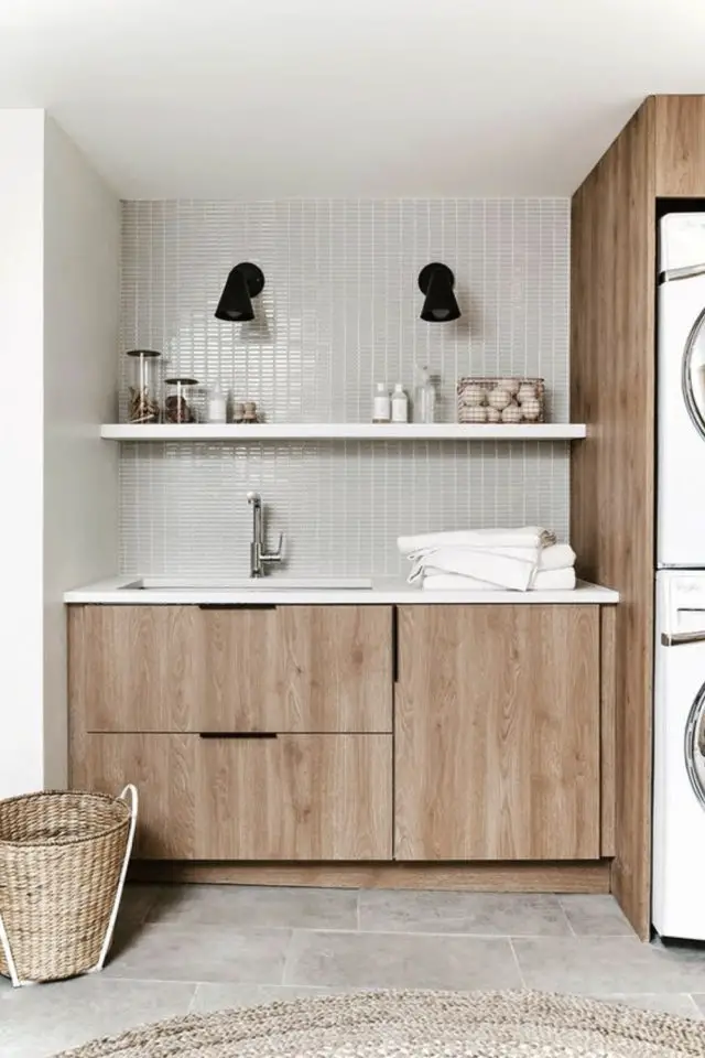 En ce moment, si je m'écoutais, j'irai me mettre dans un placard en PLS pendant quelques semaines. Je suis au bout du rouleau et je n'en vois pas la fin, du moins, elle n'arrive pas suffisamment vite. Mais ça c'est une autre histoire. Je pense que si j'avais une buanderie, ce serait la pièce où on me ficherait la paix. Je ne connais personne qui aime passer des heures à s'occuper du linge: le trier, le laver, le sécher, le repasser, le plier. Et donc ce serait une pièce où je pourrais être au calme et ne pas être dérangée tout le temps. Tant qu'à faire autant qu'elle soit jolie cette petite pièce. Ca rend les gestes du quotidien bien plus agréables. Vous le verrez juste en dessous, j'ai besoin de douceur. On trouve donc du bois, du blanc, des carrelages clairs presque pastel... J'aime aussi le côté fonctionnel qui appelle une certaine simplicité. Pas besoin d'en faire des tonnes niveau déco. Je trouve ça tellement apaisant! Pas vous?