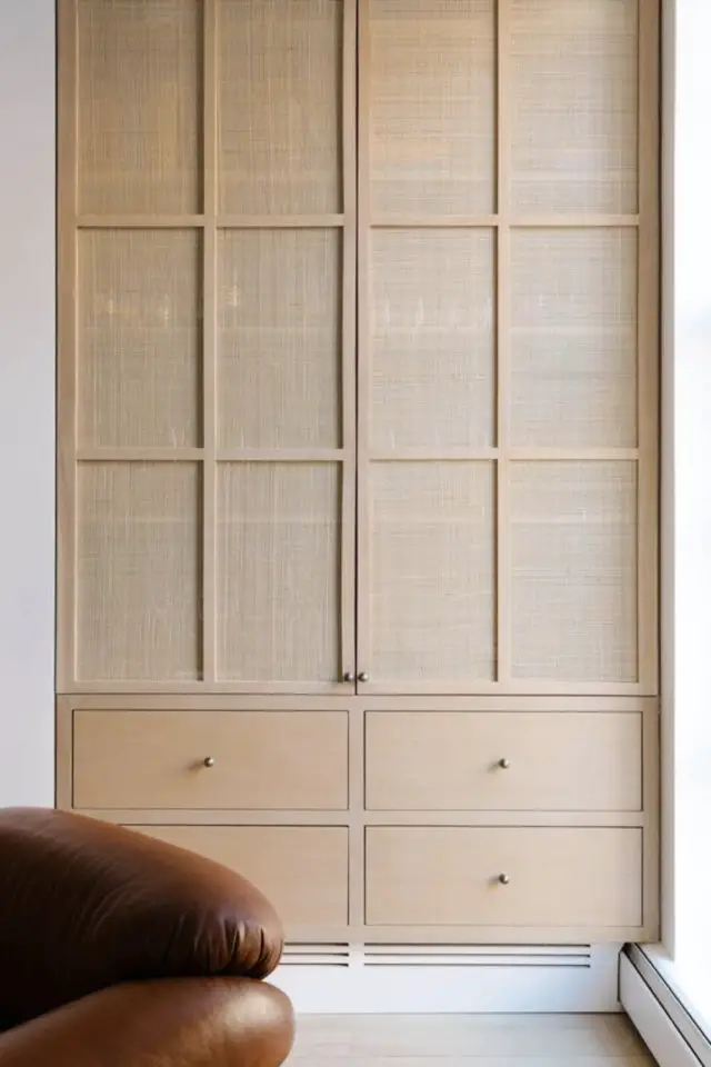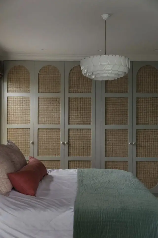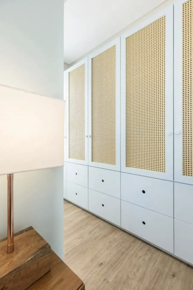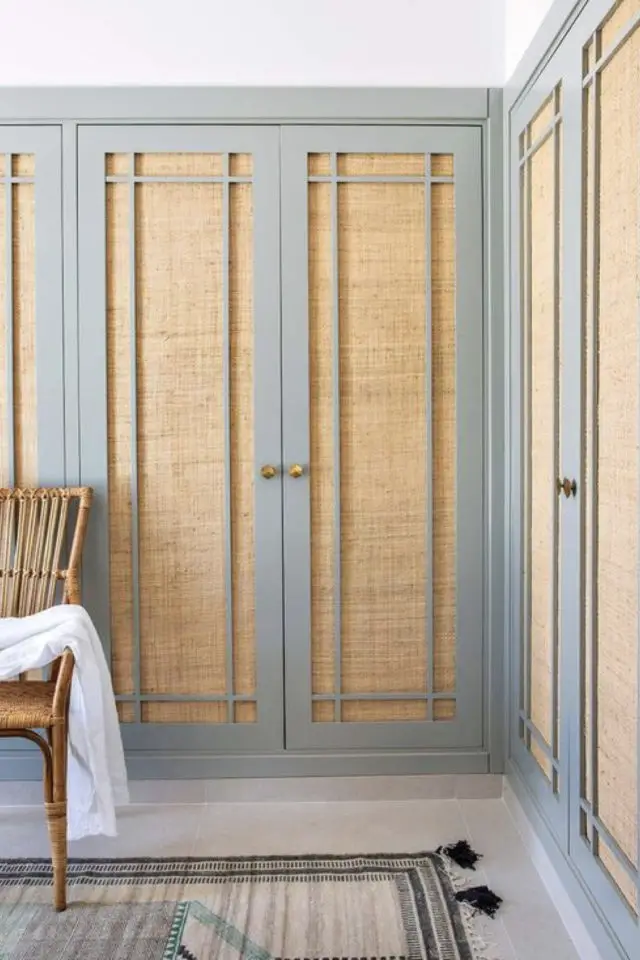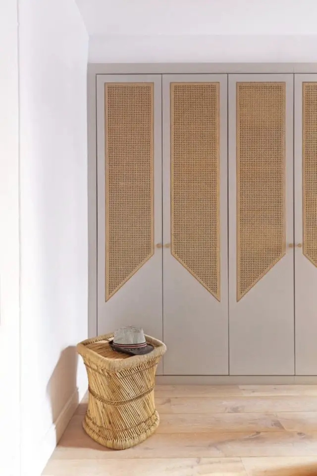 On reste dans un univers assez moderne et doux pour ce 3ème point avec du cannage. Plus besoin de le présenter, le cannage s'invite partout depuis quelques années. Mais cette technique de tissage n'est pas exclusive aux petits meubles dans les pièces à vivre. Elle peut aussi vous permettre de décorer la chambre et plus particulièrement la penderie. Cannage + bois ou cannage + peinture, à vous de choisir. Ce qui est certain c'est que les portes de la penderie deviennent visuellement plus légères, moins oppressante quand elles sont ajourées et avec du cannage. C'est aussi très chaleureux, parfait pour créer un cocon propice au repos!