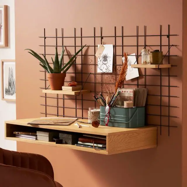 Les bureaux muraux pour minimiser l'encombrement sont pratiques surtout quand on travaille sur ordi et qu'on n'a pas besoin de beaucoup de place. L'autre avantage c'est qu'ils n'encombrent pas le sol avec des pieds inutiles. Ce type de bureau trouve aussi bien sa place dans une pièce à vivre que dans la chambre. Parfois, il est plus facile d'être au calme dans la chambre que dans le salon. Néanmoins, veillez à ranger votre espace de travail en fin de journée pour ne pas avoir trop de bazar, c'est mauvais pour le sommeil.