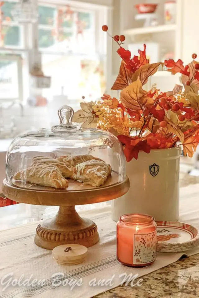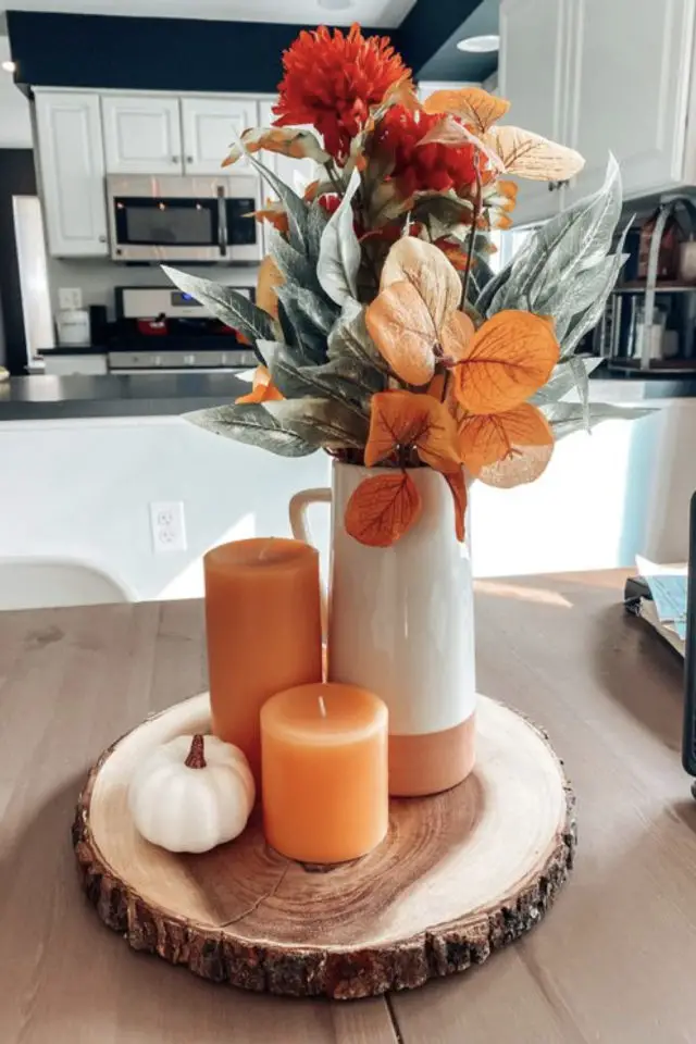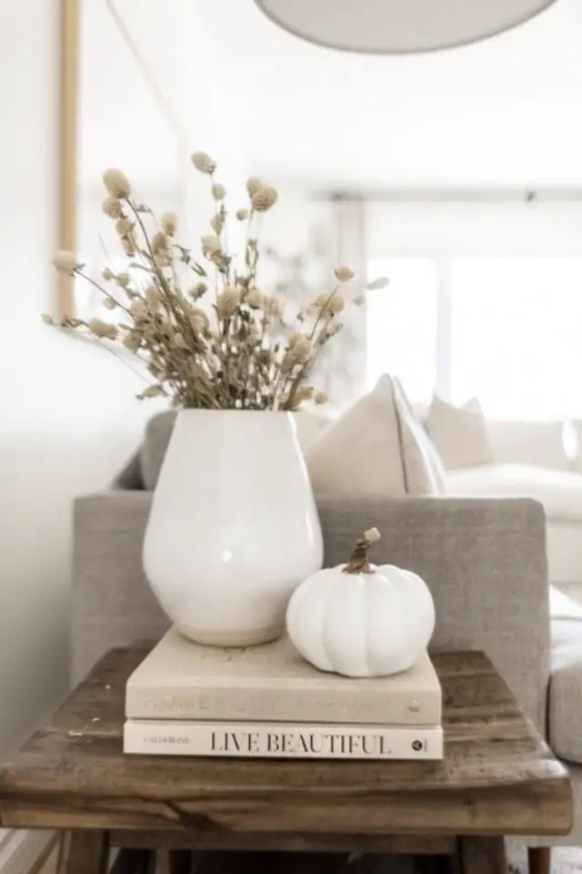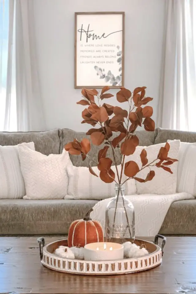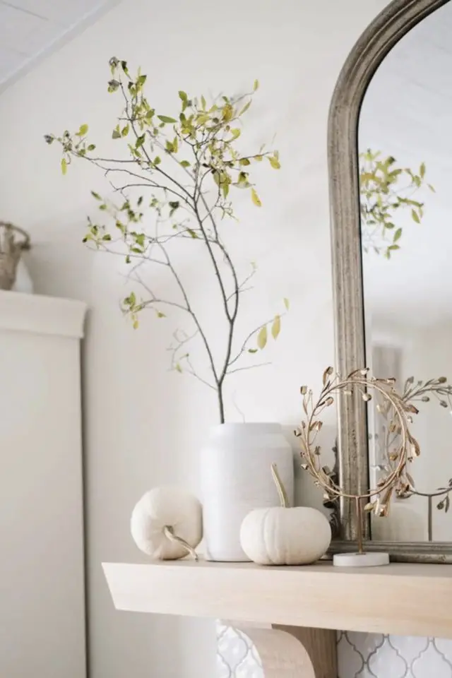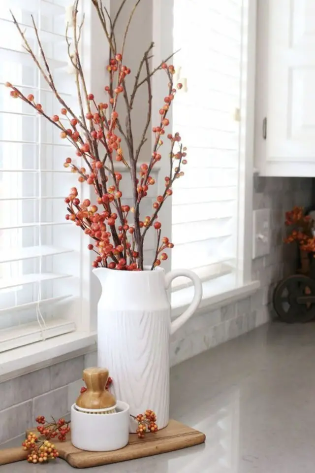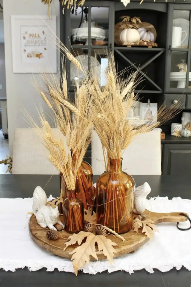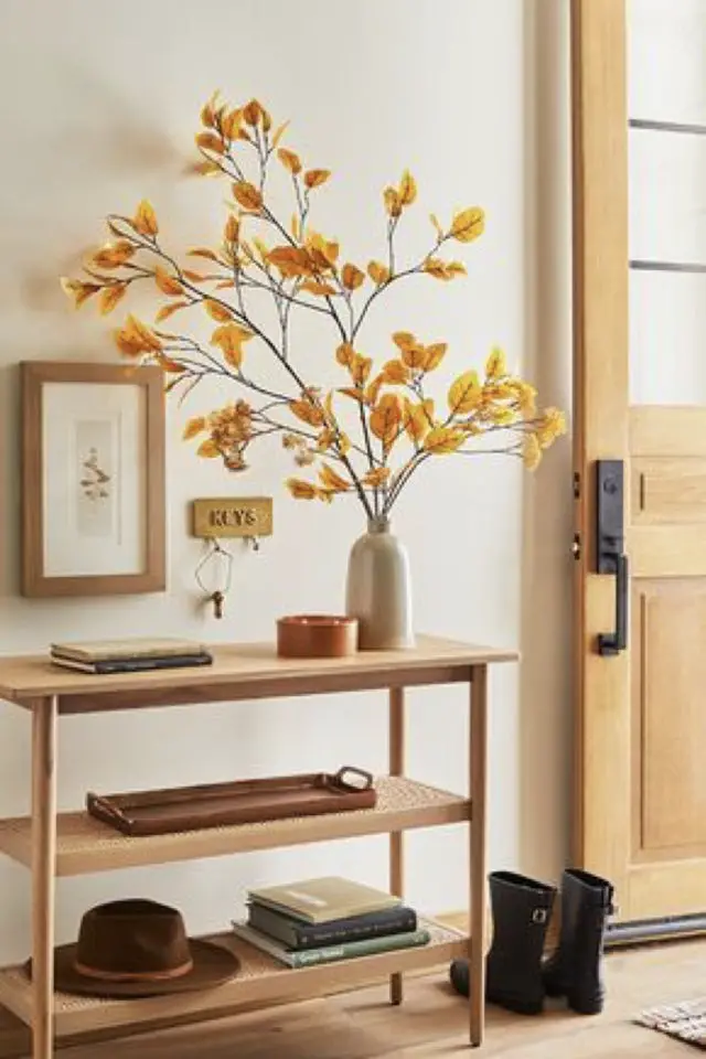 Rien de plus rapide et simple à mettre en oeuvre pour créer une déco automnale que de sortir un joli vase et y mettre des branches d'arbres, des épis de blé, des feuilles préalablement ramassées lors d'une promenade à la campagne ou en forêt. Même si vous vivez en ville, vous pouvez récupérer quelques branches mortes dans un parc. Et cette compo qui ne coûte pas grand chose peut prendre place sur la console de l'entrée, le plan de travail de la cuisine, le buffet ou encore la table basse.