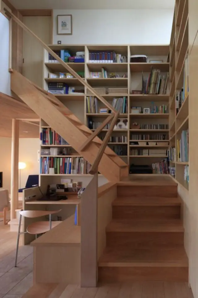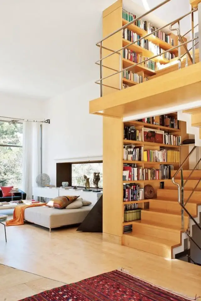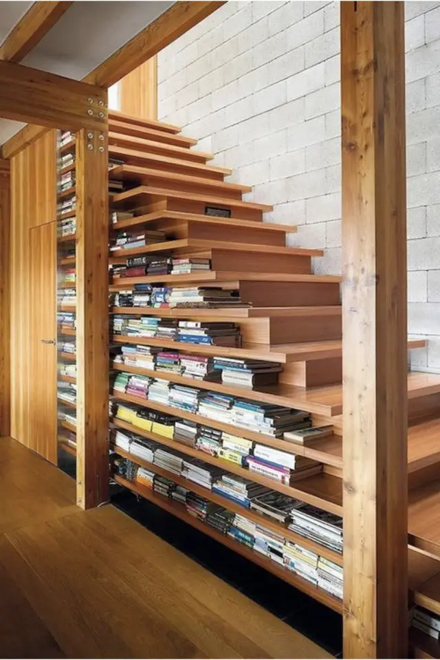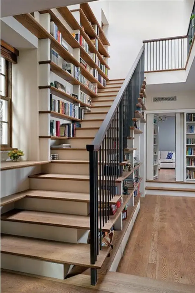 On passe à des rangements plus complexes ou du moins sur du sur-mesure mais pas moins malins. La cage d'escaliers peut-être une solution pour créer une jolie bibliothèque surtout si elle est ouverte sur votre pièce à vivre. Il y a plusieurs possibilités qui s'offrent à vous: soit vous utilisez le mur sur lequel est posé votre escalier pour aménager cette bibliothèque (et il faut que l'escalier soit suffisamment large), soit vous "posez" une étagère en guise de garde-corps. Dans tous les cas, cela donnera un nouveau style à votre intérieur.