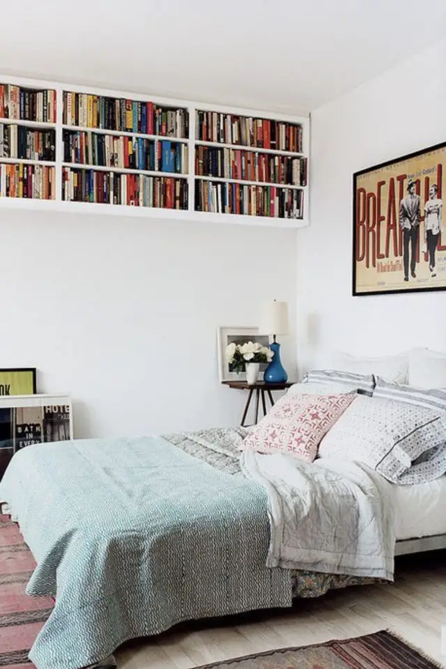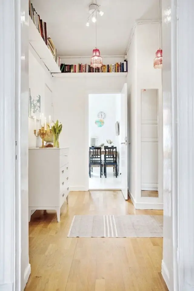 J'aime les petits espaces parce qu'ils demandent généralement à ce qu'on sorte des sentiers battus, des solutions toutes faites pour optimiser l'espace. Quand on aime lire, on peut vite se sentir oppresser dans un petit appartement remplis de "trop" de livres. Alors il faut être malin! Et par exemple, on peut utiliser l'espace sous le plafond (généralement vide) pour y mettre une longue étagère et y ranger les livres. Ca marche aussi bien dans le couloir, que dans la chambre à coucher ou encore dans le séjour.