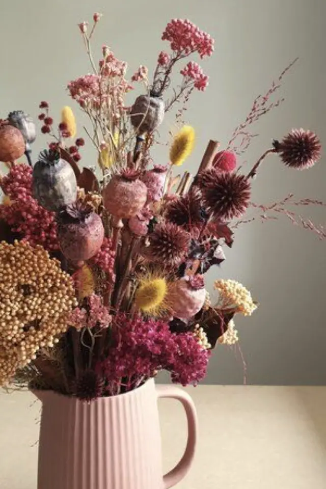 Ce qui me plait avec les fleurs séchées c'est qu'elles n'ont pas la contrainte de la saison. Pas besoin d'attendre le printemps pour avoir des fleurs fraiches et apporter de la couleur dans son intérieur. Même en pleine hiver, elles peuvent être source de joie et de bonne humeur. J'aime beaucoup. Et contrairement aux plantes d'intérieur, les fleurs séchées ne demandent pas d'entretien (il faut juste les dépoussiérer de temps en temps).