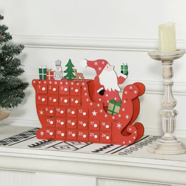 Calendrier de l'avent en bois traineau - 24 tiroirs blanc et rouge
