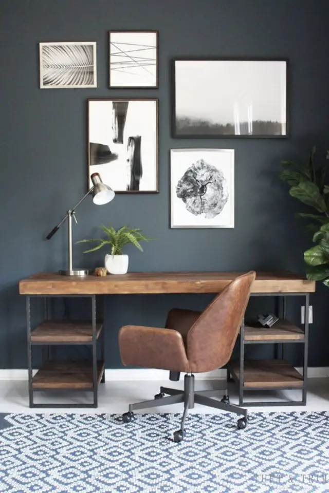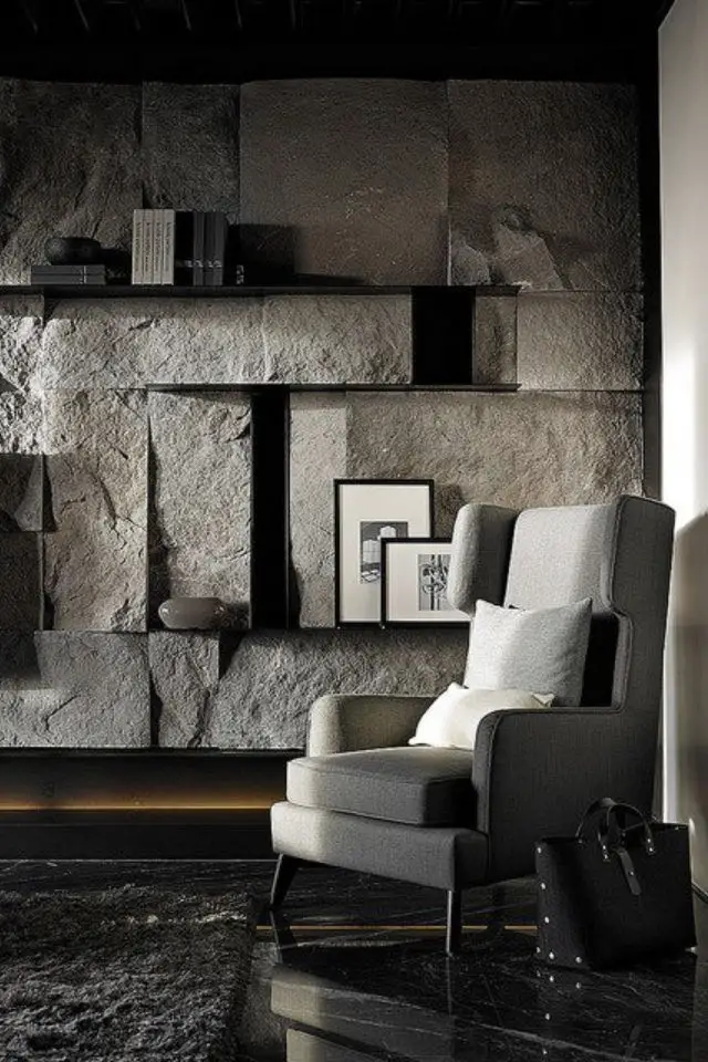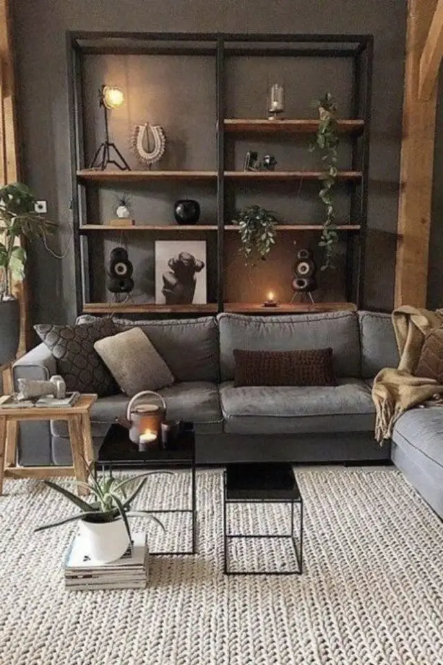 Le gris et le noir sont les deux couleurs que l'on retrouve le plus souvent dans les intérieurs de type masculins. Ces deux couleurs sont un parti-pris intéressant. Comme ce sont des couleurs qu'on utilise rarement, elles ont un fort pouvoir décoratif. Le gris est peut-être plus facile à utiliser, plus commun que le noir notamment en grande quantité. Dans ce style déco, le gris se retrouve aussi bien dans une nuance clair (gris métal) ou une nuance plus soutenue proche du noir comme le gris anthracite. Le noir quant à lui est utilisé avec plus de parcimonie. Il est parfait pour souligner certains détails structurels de votre pièce comme les boiseries.