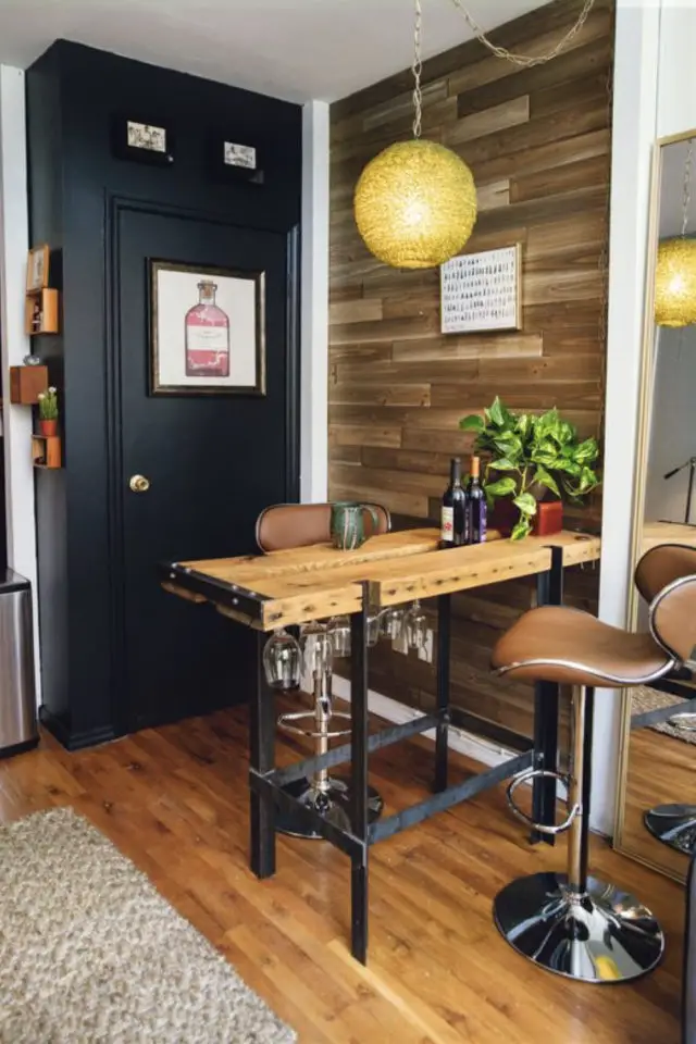 Le bois a un rôle important à jouer et on peut le trouver partout sous la forme de structure de fauteuil, d'étagères, de meubles vintage chinés... Il peut être brut, patiné, peint. C'est un caméléon qui donnera un aspect chaleureux à votre pièce. Surtout que ce style est assez sombre. Le bois va permettre de créer un équilibre.