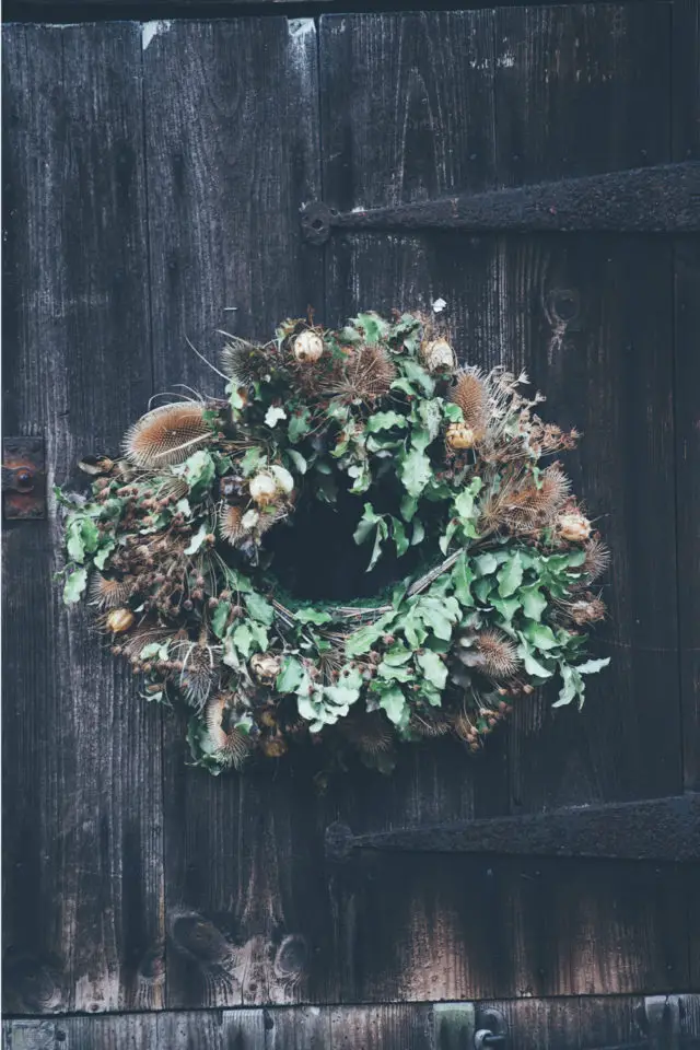 - Une couronne de noël associant bois et d'autres éléments naturels comme l'eucalyptus, du sapin ou des rondelles d'orange séchées.