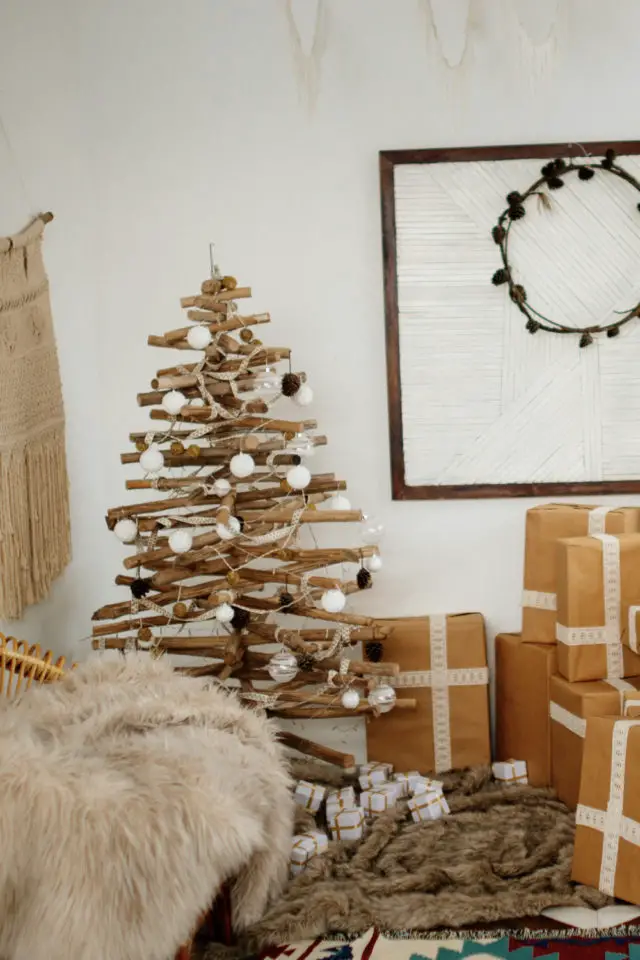 - Des étoiles fabriquées avec des brindilles et de la ficelle ou des chutes de tissus.