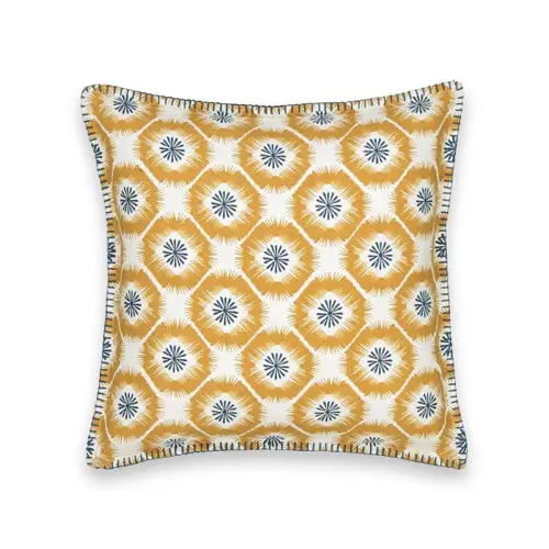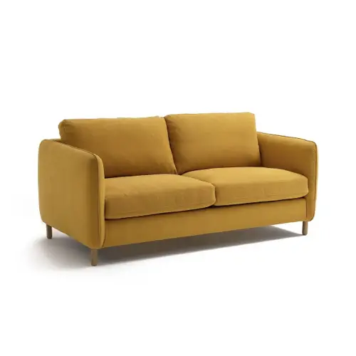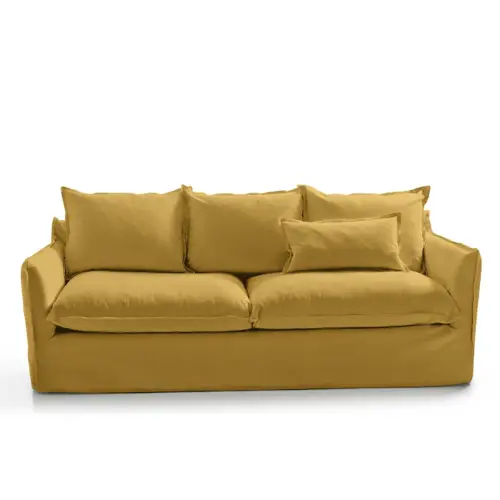 04 • Retour sur une ambiance qui a mes yeux est plus équilibrée. Des murs blancs. De la couleur sur le tapis, sur les housses de coussins, sur le canapé qui n'est pas juste jaune. Il a aussi un très joli liseré bleu qui met en évidence ses formes. On trouve aussi la couleur grâce aux deux affiches qui surplombent le canapé. Cet ensemble crée une atmosphère à la fois moderne et éclectique.
