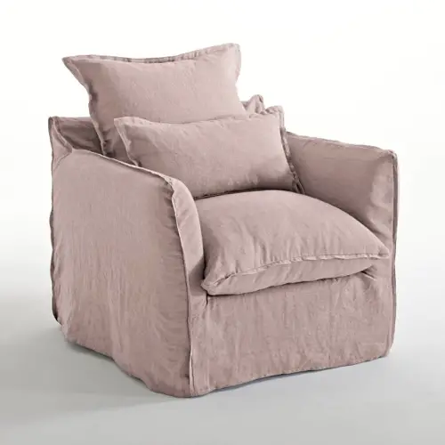 13 • Au mur, un duo de rose. Un soubassement rose plus franc associé à un rose plus clair au dessus. L'absence de moulures ou de tout autre élément pour marquer la séparation entre les deux nuances de rose confère à la pièce une atmosphère moderne. Elle est contrebalancée par un sentiment plus vintage créé par le canapé en velours ocre et les affiches rétro encadrées et disposées en patchwork au dessus du canapé.