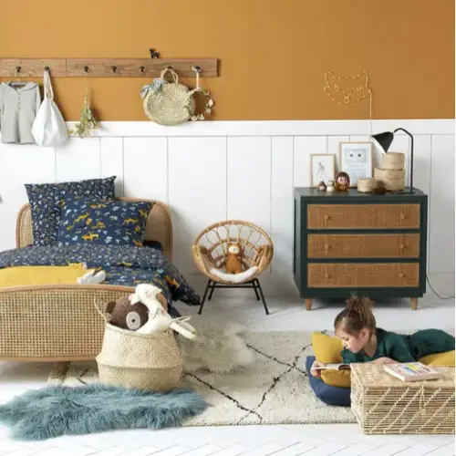 Dans l'évolution de ce style, on va aussi trouver des inspirations plus modernes et naturelles: Tapis en jute rond, meubles en cannage, illustrations abstraites et organiques, panier en rotin, tapis berbère... On connait toutes et tous ces accessoires déco. On les trouve ailleurs dans la maison. Le côté naturel va venir compléter le bois déjà présent dans la chambre pour créer une décoration harmonieuse et bienveillante.