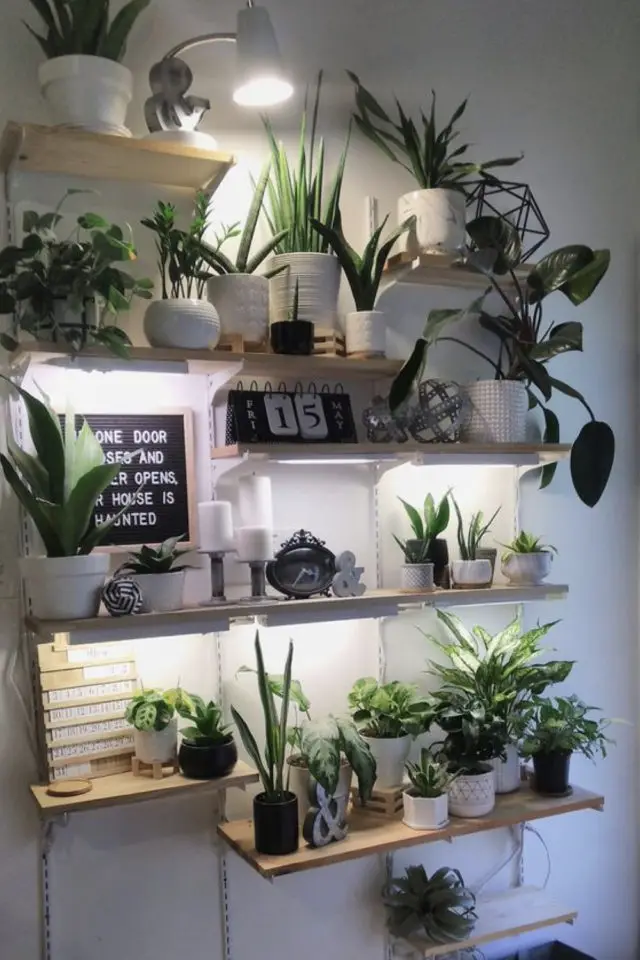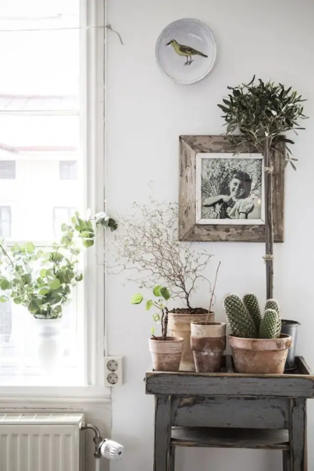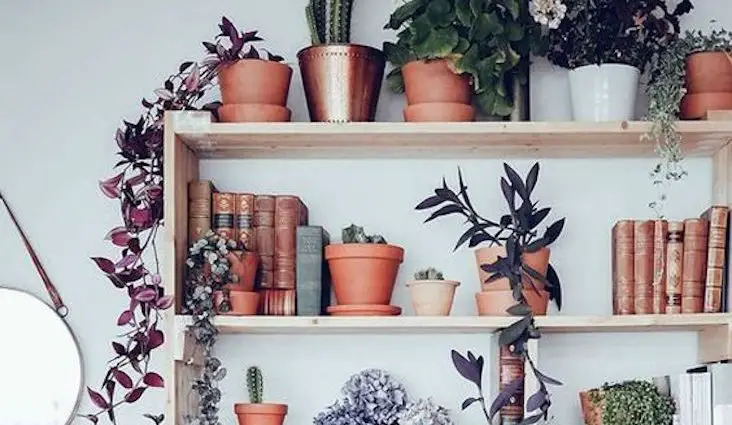 - Utiliser des bibliothèques pour poser un tas de petites plantes (remplacer les livres par des pots de fleurs);