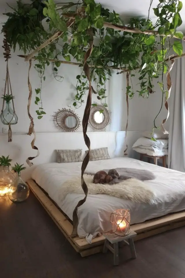 - Suspendre des plantes sur une étagère au dessus du lit.