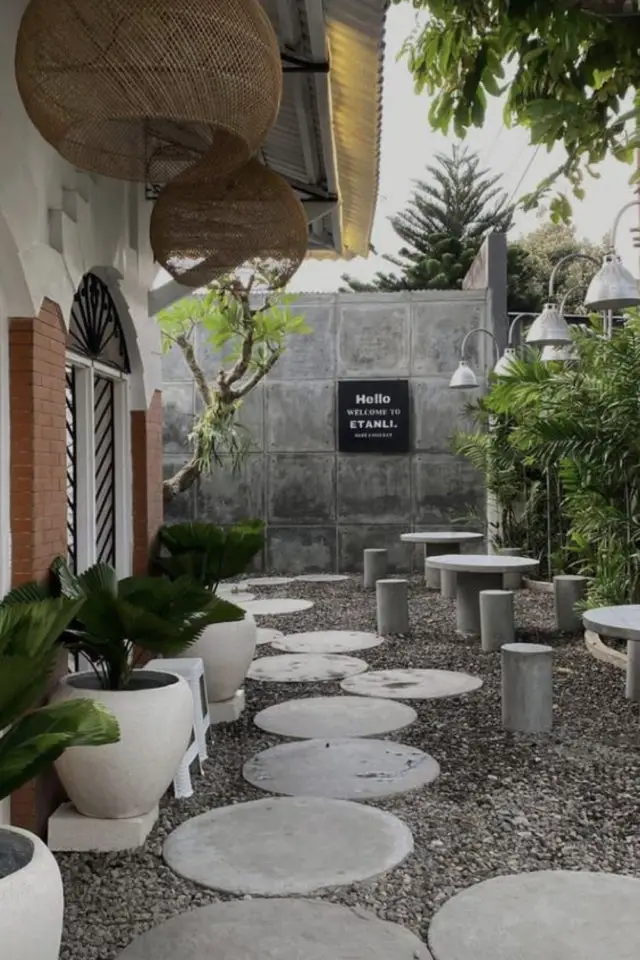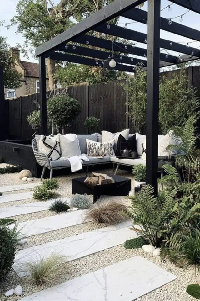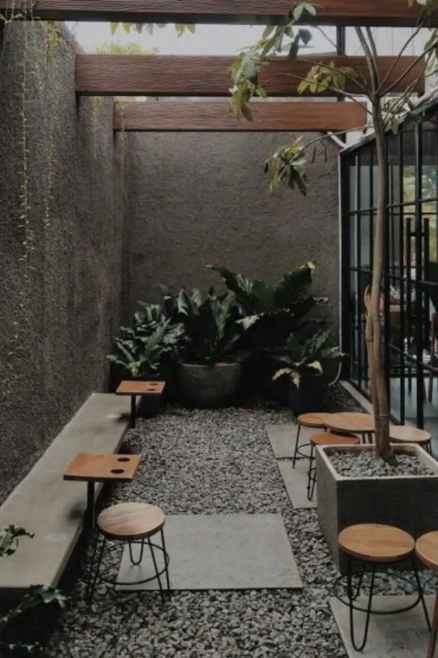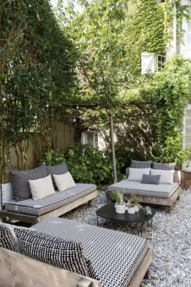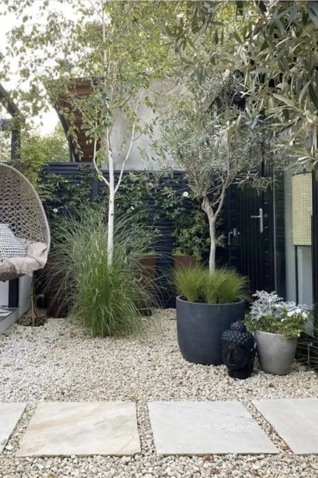 On commence cette semaine et cet article avec la terrasse. J'ai déjà eu l'occasion de vous parler de revêtements de sol pour la terrasse, néanmoins, j'ai eu envie de partager avec vous quelques images pour compléter l'article de l'an passé. Et il est question de terrasses en graviers. C'est un choix assez singulier. Les graviers demandent de la préparation avant de les étaler sur le sol. Ne mettez jamais des graviers à même la terre, en quelques semaines ils vont disparaitre et vous devrez tout recommencer. Il est nécessaire d'installer du géotextile qui évitera à la terre de couvrir vos graviers. D'in point de vue plus esthétique, les graviers peuvent donner un look très moderne à votre terrasse. Ils sont moins austère qu'un simple béton. Et on peut s'amuser à créer des allées avec des dalles au milieu des graviers. C'est plus pratique pour marcher mais c'est aussi une manière de donner du rythme, de la vie à votre espace extérieur. J'aime aussi les graviers parce qu'ils sont très simples. Ils se marient à la perfection avec du bois et des plantes.