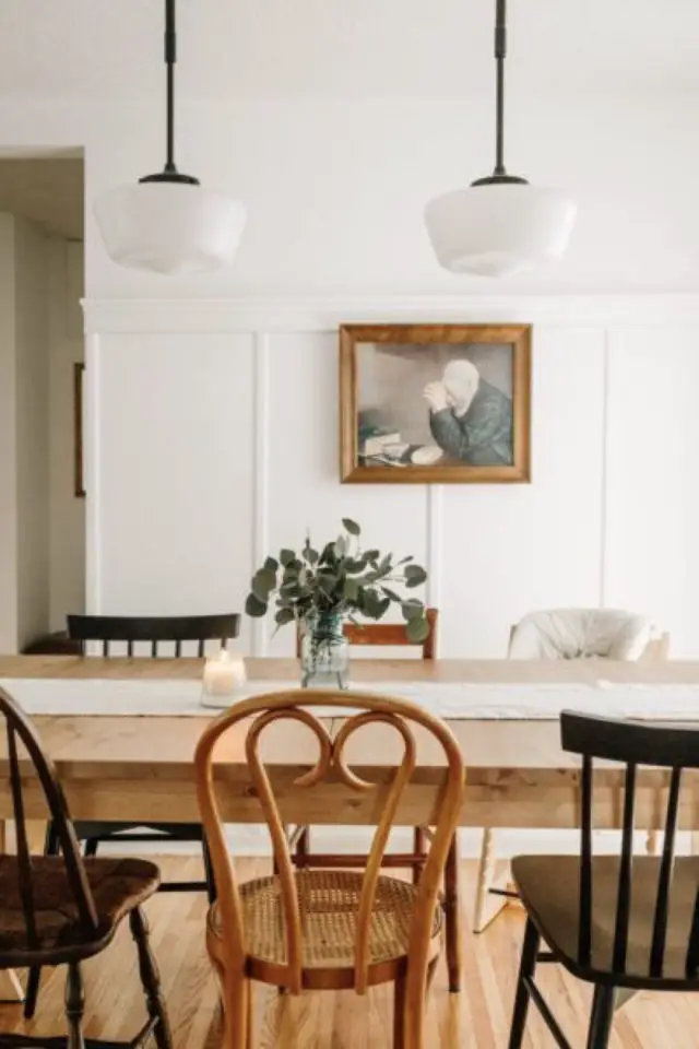 Je l'ai déjà évoqué, les chaises autour de la table de salle à manger font partie intégrante de votre déco mais coûtent aussi assez cher. (Si vous avez un petit budget pour vos chaises, découvrez cet article) L'une des possibilités pour faire des économies c'est de chiner les nouvelles chaises de votre espace repas. C'est la saison, les braderies vont reprendre peu à peu et c'est l'occasion de faire de bonnes affaires. Il n'y a pas de règles bien définies pour choisir de nouvelles chaises pour la salle à manger surtout si elles sont vintage. On peut avoir du bol et tombé sur un ensemble de 6 ou 8 chaises identiques en bon état. Ou on peut jouer la carte du mix and match et mélanger les styles, les matériaux et les couleurs. Cela donnera une dynamique très personnelle à votre pièce mais aussi beaucoup de cachet!