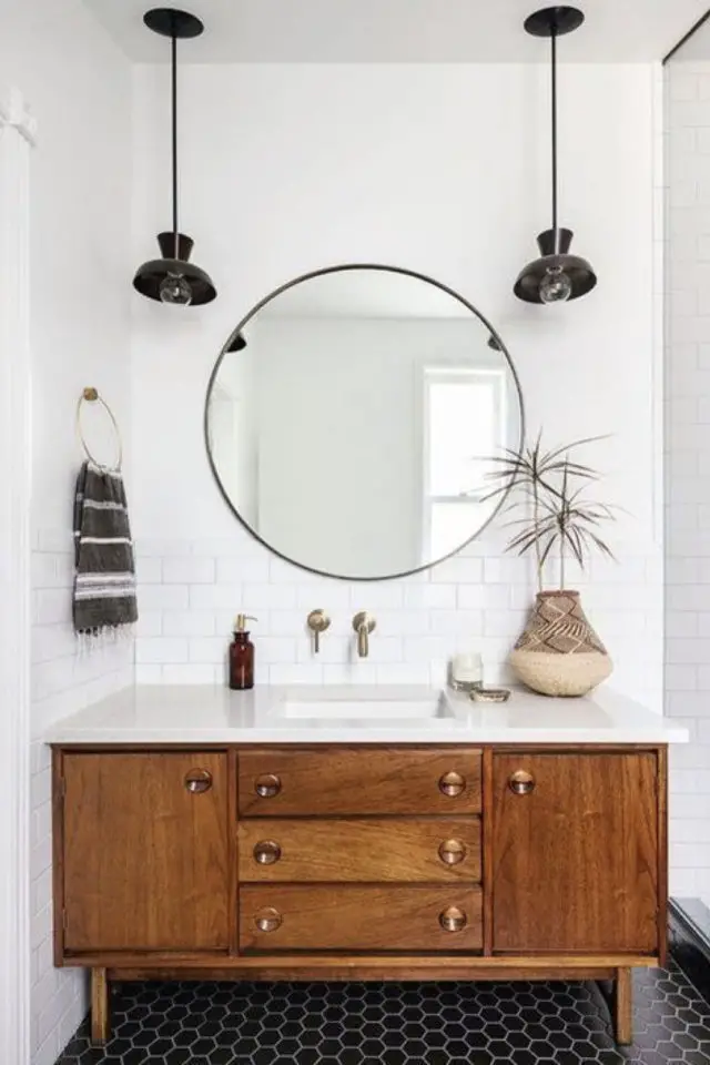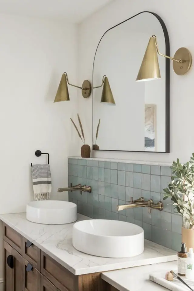 On commence avec le miroir de la salle de bain. Plus besoin de présenter son côté pratique, on sait toutes et tous que c'est un indispensable. En revanche, le miroir peut être un élément de votre décoration à part entière et pas juste un élément fonctionnel. On le trouve généralement sous deux formes: l'armoire miroir qui permet de ranger (cacher) ce qui sert au quotidien ou le miroir plat qui est juste fixé au mur. L'armoire est un peu plus épaisse qu'un miroir simple, c'est à prendre en compte. La tendance ces dernières années est au miroir simple sans rangement. En revanche, la forme du miroir, sa taille et son encadrement sont à choisir avec soin. Pendant quelques années, le miroir rond a fait des émules. En revanche, on voit de plus en plus de miroirs arrondis, en arche ou de forme ovale. On garde l'idée de douceur relative à la rondeur mais avec un peu plus élancés. J'aime aussi beaucoup les miroirs vintage, chinés en brocante, avec des angles adoucis, un encadrement discret et sobre, un peu dans l'esprit miroir de barbier. C'est un style qui donnera beaucoup de personnalité à votre salle de bain.