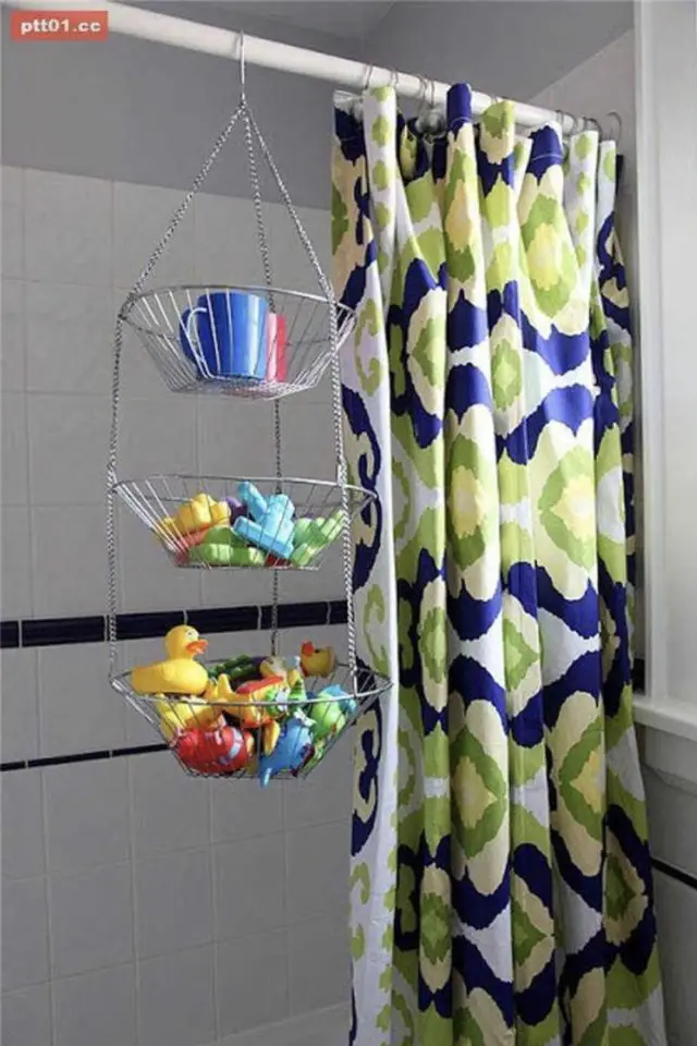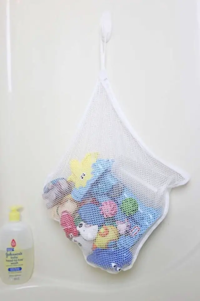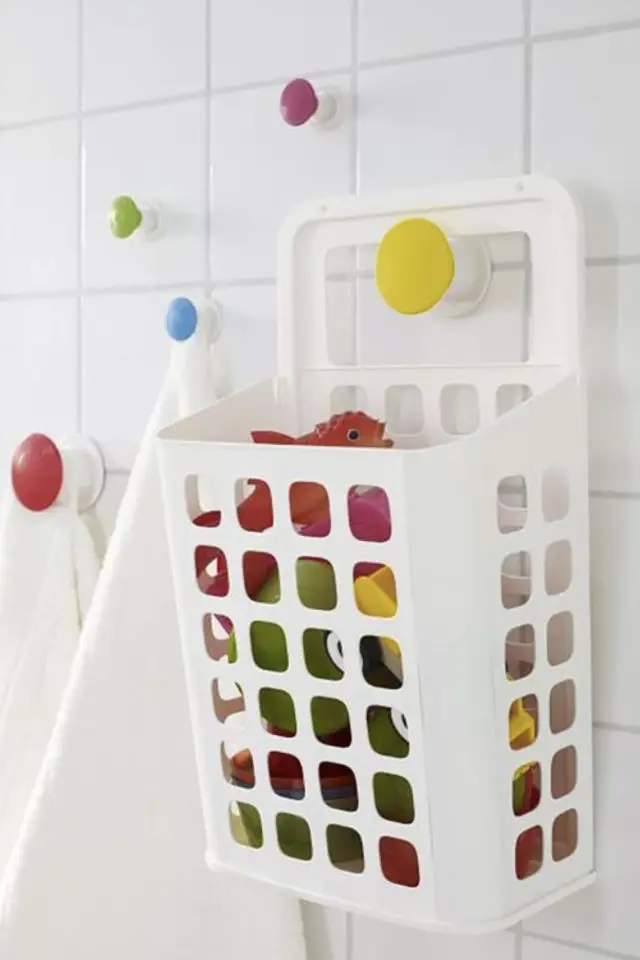 Je n'ai pas d'enfant mais j'ai mes proches qui en ont et on peut difficilement parler déco de salle de bain à des parents sans aborder la question des jouets qui occupent les enfants dans le bain et qui occupent aussi l'espace! Un filet suspendu à un crochet / ventouse au carrelage peut être efficace dans une petite salle de bain. Si vous avez un peu plus de place, un bac avec des trous (pour que l'eau s'évacue) peut être la solution. En revanche, ne comptez pas sur moi pour vous donner des conseils pour que votre enfant range ses jouets après le bain. Ce n'est pas mon domaine d'expertise!