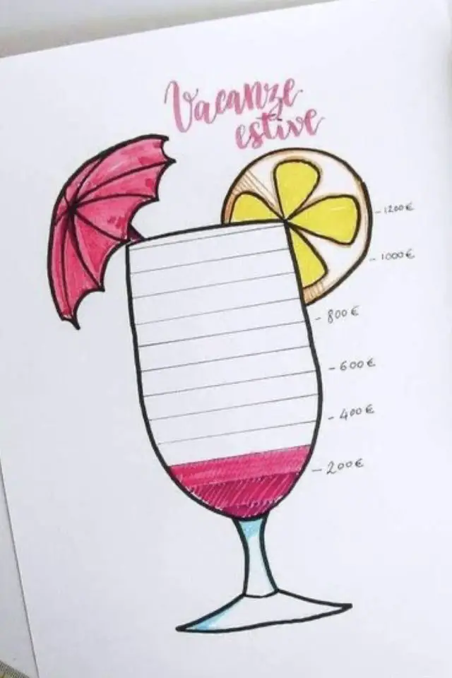 - Le verre à cocktail qui se rempli à chaque fois qu'on atteint un nouveau palier d'économies. J'aime l'idée qui donne le ton des vacances. Ca permet de visualiser clairement l'objectif;