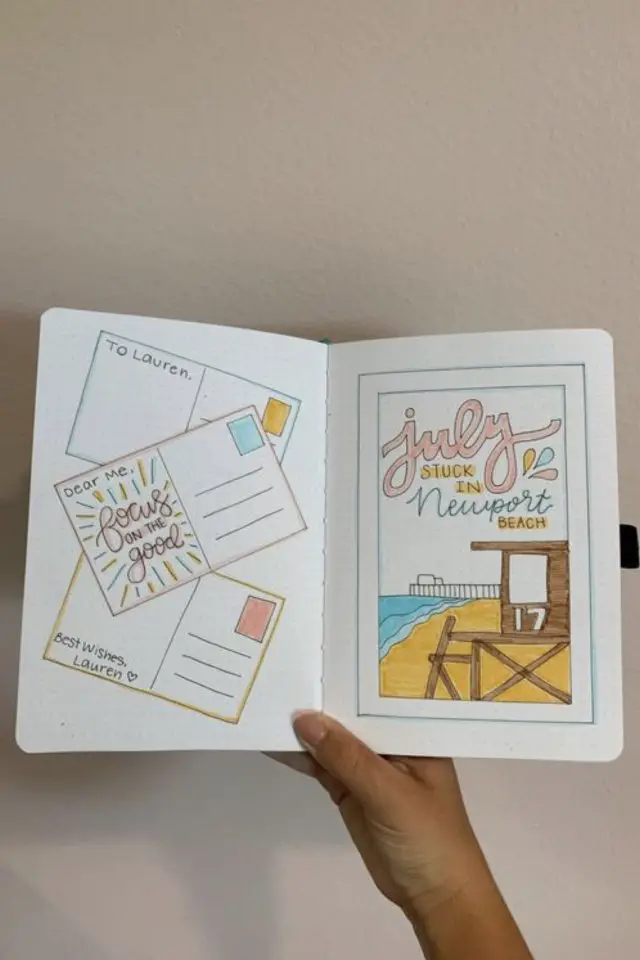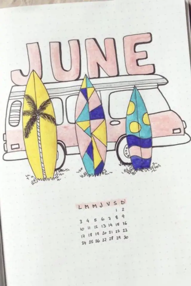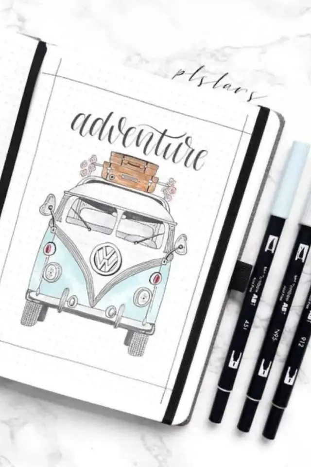 Parce que le bullet journal se différencie d'un agenda classique entre autre par ses illustrations j'ai eu envie de vous proposer d'autres idées à décliner sur le thème des vacances. On peut s'inspirer des paysages (ou d'un élément qui compose le paysage comme les palmiers), de cartes postales (un art qui se perd mais qui est résolument slow), d'un voyage en van (je l'ai écrit plus haut, ce mode de vacances à la cote, je vois dans mes proches de plus en plus de monde choisir ce mode de vacances), d'un voyage en avion, du camping (les tentes sont assez faciles à dessiner), de cocktails, de piscine, de globes terrestres