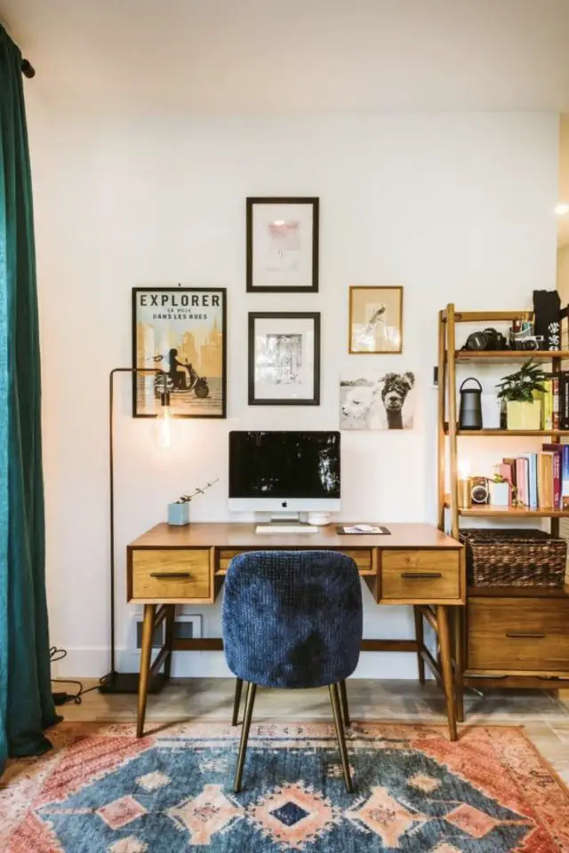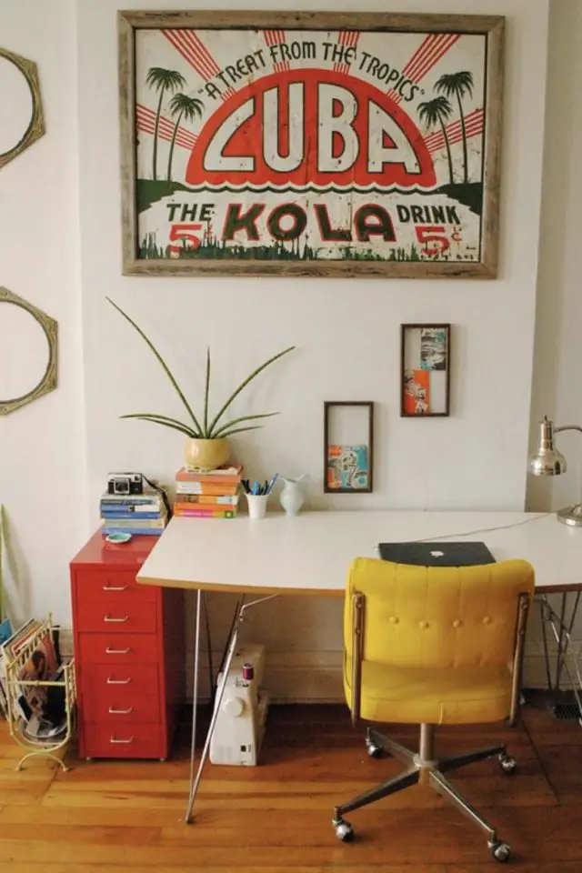 Côté espace de travail, on peut aussi récupérer une lampe de bureau et un fauteuil. Pour ce dernier, il sera peut-être nécessaire de le huiler un peu s'il est pivotant, resserrer les roulettes, et, éventuellement le re-tapisser si le textile d'origine est abimé. Pour les lampes de bureau, avec un peu de bol, vous pouvez tomber sur une pépite design des années 50. Ce sont des accessoires qui sont souvent oubliés dans un grenier plusieurs décennies et qui arrivent en brocante. Là aussi cela donnera beaucoup de caractère à votre espace de travail.