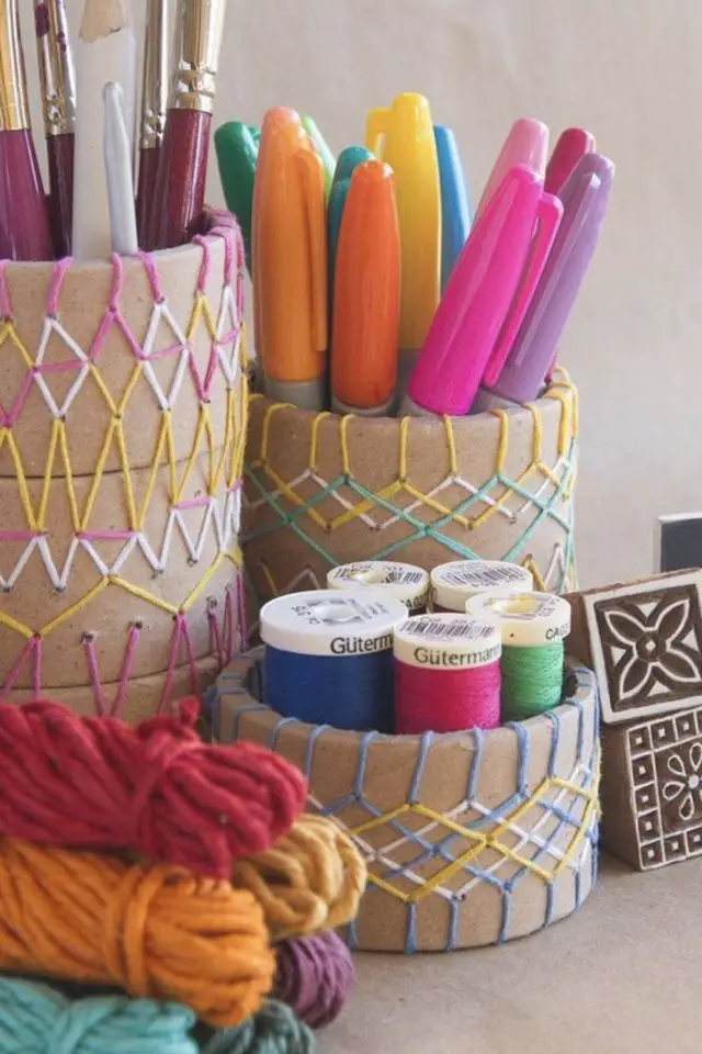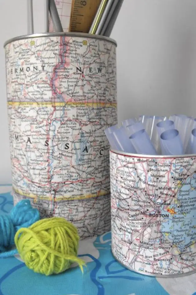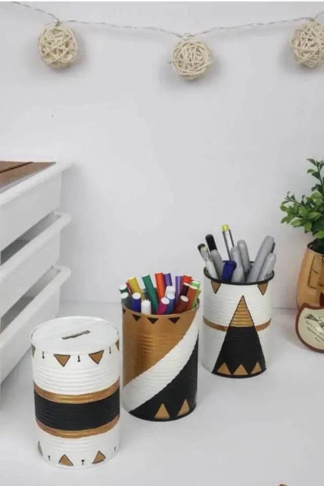 L'exemple de récup' / zéro déchet le plus flagrant c'est le détournement de boites de conserve en pot à crayon ou tout autre pot pratique pour que rien ne traine sur l'espace de travail. La seule chose à veiller est de bien faire attention que les bords de la conserve ne puissent plus vous couper. Après, c'est juste de la customisation: peinture, papier kraft, papier de récup', laine, ancien t-shirt, crayons... sont vos alliés pour personnaliser et transformer les boites de conserves sur le bureau.
