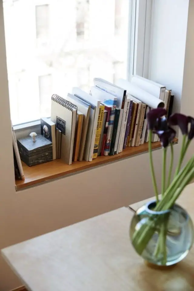 Si vous aimez lire, vous savez que c'est une passion qui peut prendre de la place! Néanmoins, vos anciennes lectures que ce soit sous forme de livres ou de magazines peuvent se transformer en éléments décoratifs. (C'est toujours mieux que d'acheter des boites vides qui font style "c'est un livre" juste pour l'esthétique comme on a pu le voir il y a quoi? un ou deux ans? Bref!) Les piles de livres / magazines sont souvent utilisées comme accessoires déco par exemple sur une table basse. Cela crée un décor qui semble vivant, moins épuré. Et normalement les tranches des livres ainsi que leurs titres donnent des indications sur la personnalité & les goûts des gens qui vivent dans la pièce. Etant moins dans l'apparence que dans le fonctionnel, je préfère quand le rebord de fenêtre se fait pratique et se transforme en micro-bibliothèque.