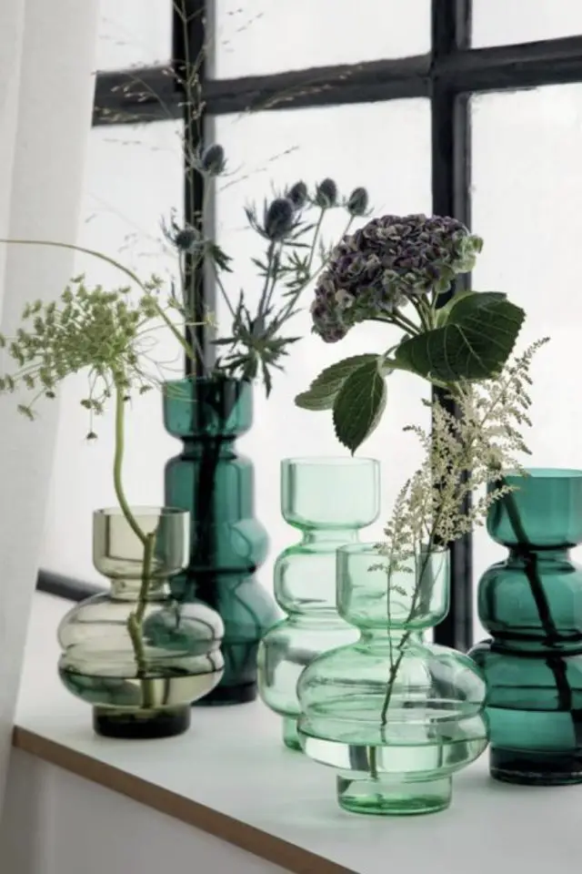 La fenêtre ce n'est pas uniquement une ouverture sur l'extérieur, un apport de lumière extérieure. C'est aussi une vitre et donc une transparence qui laisse voir. On peut très bien partir de cette idée pour imaginer une déco à proximité. Vases, photophores, boites, cloches, en verre transparent et / ou coloré vous permettent de décorer sans entraver le passage de la lumière naturelle ni la vue qui donne sur l'extérieur. Cela renvoie à de la délicatesse, une certaine fragilité, une présence légèrement perceptible. C'est une sensibilité différente.