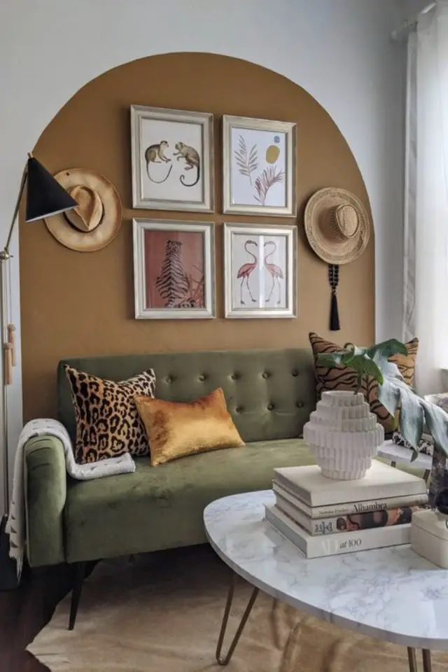 Retrouvez ici des idées pour associer étagères et une arche murale peinte sur vos murs.