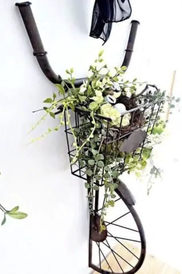 J'ai été assez étonnée par toutes les possibilités d'upcycling quand il est question de vélo. Avant de m'intéresser de plus prêt à la thématique, je connaissais bien sûr le vélo transformé en console. J'avais aussi vu de jolies compositions florales sur des roues de vélo (comme l'image à côté). Mais ça se limitait à cela. J'ai donc découvert un tas de manières de faire preuve de récup' avec un vélo.