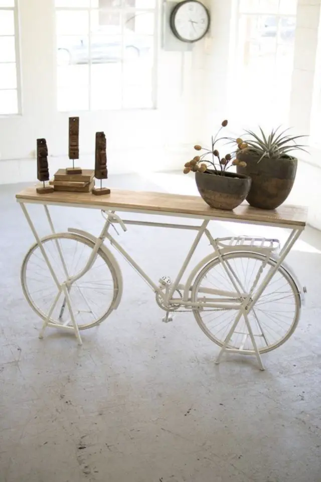 Il y a des choses plus ou moins faciles à mettre en oeuvre. Le plus facile selon moi c'est de transformer une roue de vélo en pêle-mêle photo ou pourquoi pas en moodboard. Il suffit de bien nettoyer la roue et tous les rayons, éventuellement la bomber de peinture et le tour est joué. Vous avez une nouvelle déco murale! D'autres possibilités demandent un peu plus de bricolage notamment du découpage quand on s'attaque au vélo en tant que tel. Et le minimum est d'avoir une scie à métaux (et de quoi poncer pour ne pas se blesser). Avec un vélo on peut créer des luminaires (c'est le cas aussi avec un skateboard), de la déco murale (encore). Il y a aussi des créations plus étonnantes comme l'utilisation du pédalier pour créer des patères murales, cela donnera un petit effet industriel à votre déco. Dans la même veine, il est possible de transformer un vélo en tabouret de bar. Cela demande bien plus de temps à réaliser mais vous aurez une déco unique!