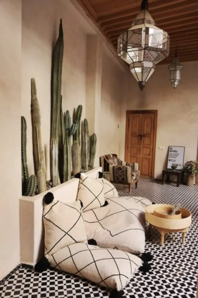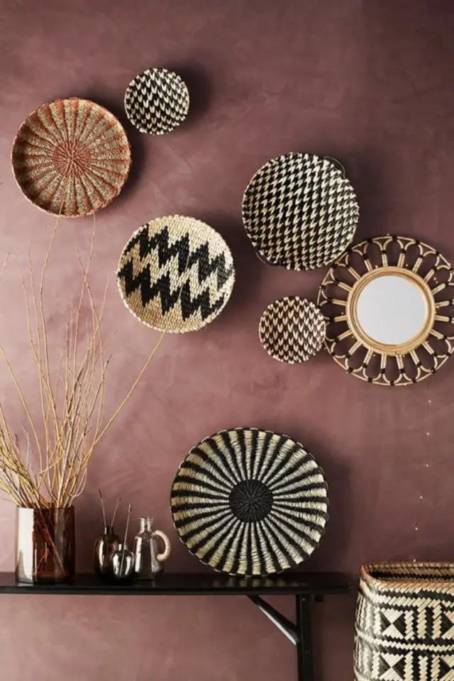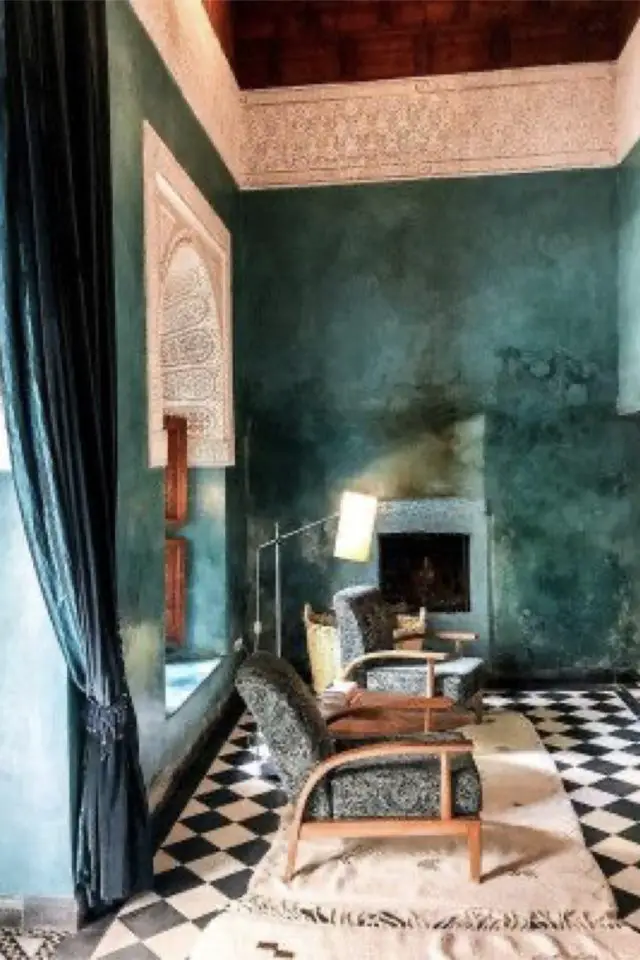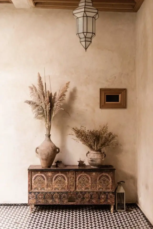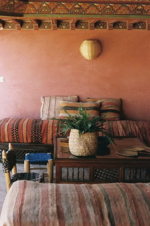Répandu au Maroc, le tadelakt est un revêtement mural que l'on trouve facilement dans les magasins de bricolage. C'est une alternative aux revêtements muraux classiques comme la peinture ou le papier peint qui vous fera voyager de l'autre côté de la mer Méditerranée. Le tadelakt se retrouve dans différents coloris généralement inspirés de pigments naturels et donne des reflets à vos murs. Cela prend bien évidemment plus de temps que d'accrocher quelques photos sur les murs mais vous vous assurez un dépaysement immédiat quand vous rentrerez chez vous après une (trop) longue journée de travail. Associé à des textiles, des matériaux ou des souvenirs ramenés de voyage, le tadelakt vous aidera à créer une ambiance Riad bohème très facilement.