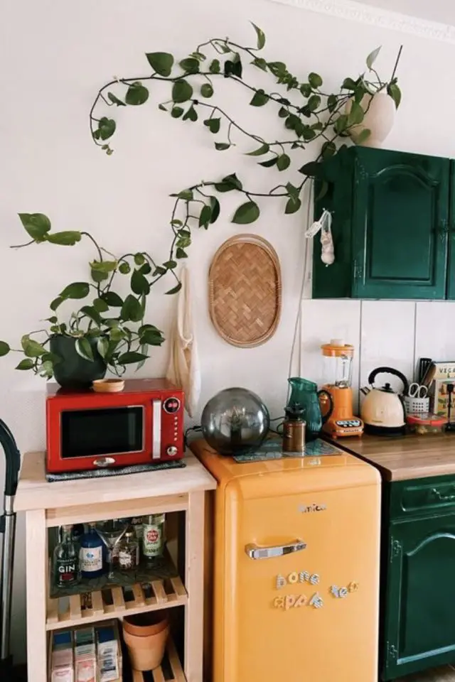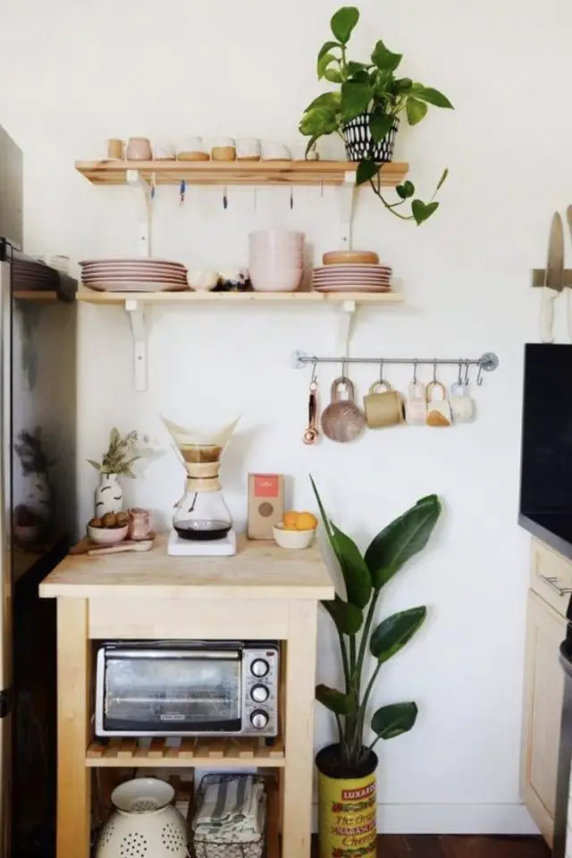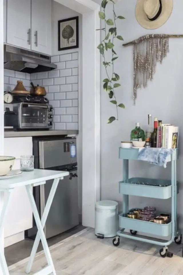 Ici l'idée est d'être malin et de gagner de la place en même temps quand c'est possible. Autrement dit, il faut optimiser l'espace un maximum pour que ce soit agréable de cuisiner (même si ce n'est que pour faire des pâtes). Dans un petit appart, il est fréquent aussi que la cuisine soit ouverte sur la pièce à vivre. Et dans ce cas, elle va influencer votre ressenti sur le côté brouillon / bordélique. D'où l'importance d'avoir de quoi ranger et organiser la cuisine. Tout ce qui est installations murales sont d'une grande aide. Cela désencombrera le plan de travail. On peut aussi penser à un meuble d'appoint pour poser l'électroménager parce qu'en général le plan de travail est réduit et tant qu'à faire autant ne pas l'encombrer un peu plus avec le micro-onde!