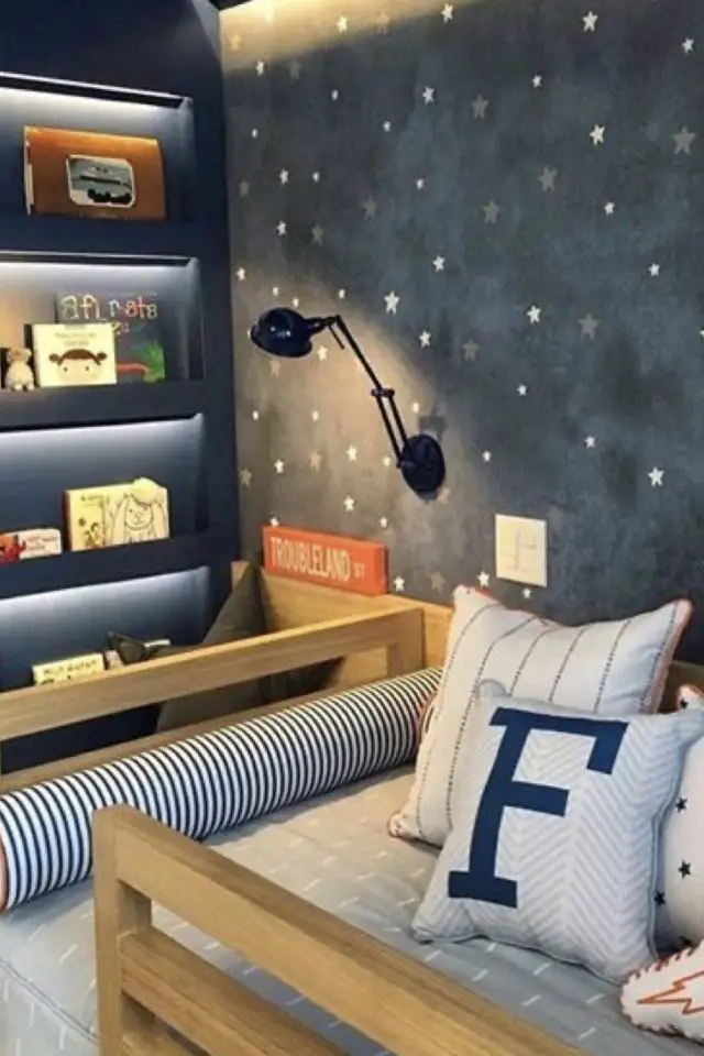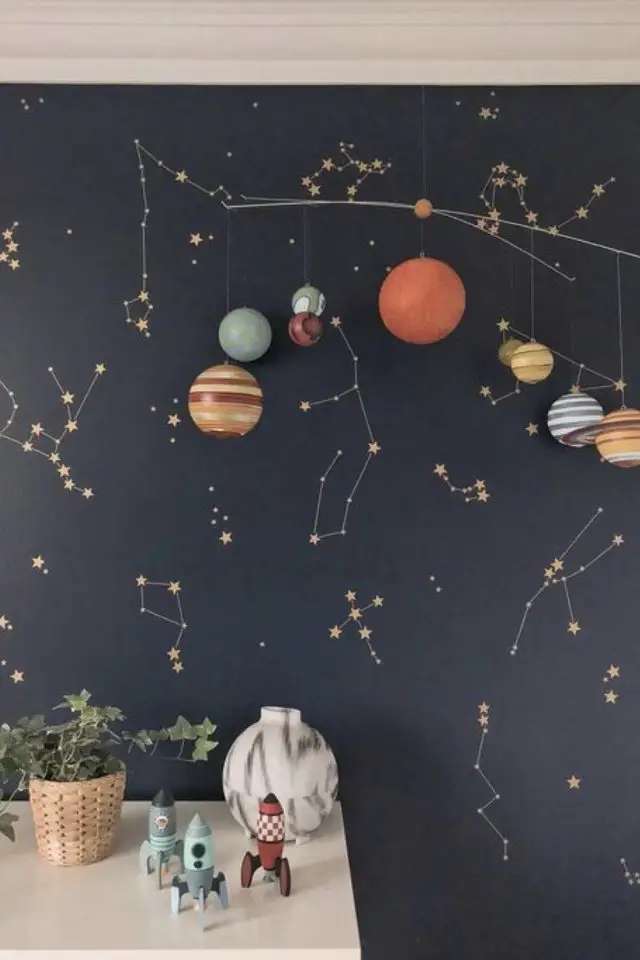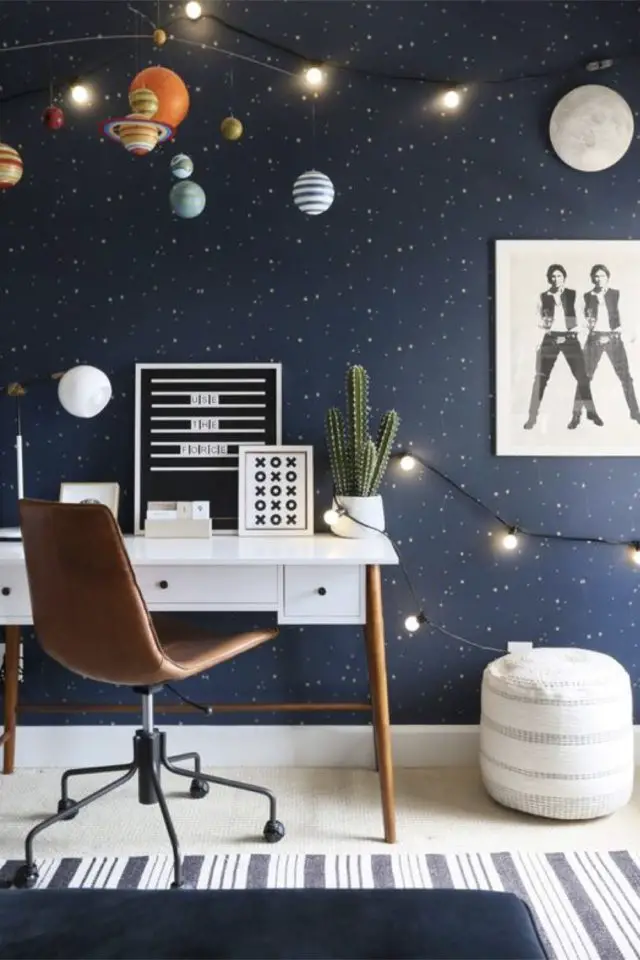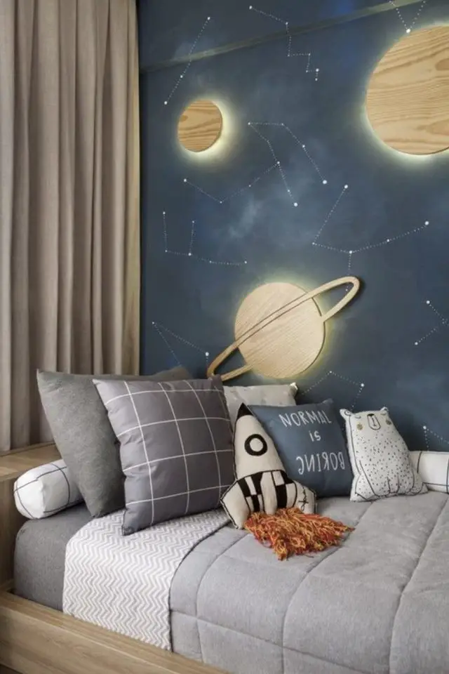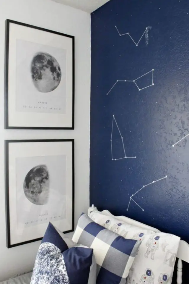 Je termine cette sélection avec l'univers de l'enfant. J'attends la rentrée pour me remettre à écrire à ce propos plus longuement. Pour le moment je vous propose de patienter avec un thème intemporel, pas nécessairement dédié aux garçons: l'espace et les étoiles. Niveau trame couleur, on a une dominante de bleu foncé (bleu nuit, bleu pétrole...) On va aussi trouver de petites touches de blancs (pour les étoiles), de jaune sablé (pour la lune et les autres planètes). C'est un thème que souvent les parents aiment bien parce qu'il pousse les enfants à la curiosité, à l'imaginaire et à l'apprentissage.
