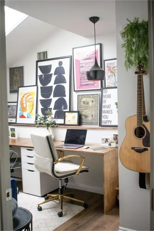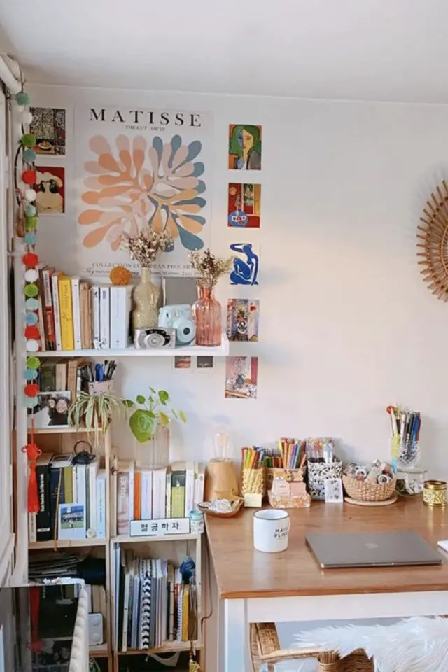 Passons au bureau... Je vais vous en parler régulièrement ces prochaines semaines. C'est la saison on va dire. Les vacances sont le moment idéal pour faire du tri dans le bureau, refaire de la place afin de commencer une nouvelle année scolaire sur de bonnes bases. Sans changer de gros meubles ou quoi que ce soit, il est assez facile de rafraîchir l'ambiance de l'espace de travail grâce à la décoration murale. Sur les images juste en dessous, vous verrez qu'il y a de nombreuses possibilités. J'ai déjà parlé de moodboards par exemple. On peut aussi mettre des étagères pour de la déco, des bouquins, des plantes... Perso, j'aime quand la décoration de mon bureau est éclectique, quand elle composée d'un tas d'objets. Comme ça quand j'ai une petite baisse de concentration, ça me change les idées. Ca me donne même parfois des pistes, des idées, des thèmes que j'ai oubliés...