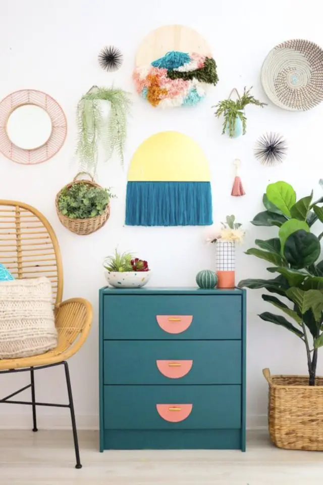 Encore hier dans ma vraie vie, j'expliquais que j'aimais le blanc, passionnément. Je sais qu'il y a un tas d'autres couleurs mais le blanc surtout sur les murs (vachement moins sur les canapés par exemple sauf celui-ci) a une place singulière dans mon esprit. Le blanc est facile à vivre la plupart du temps. Ce neutre laisse place à une touche de folie si l'envie nous en dit. Et cette folie peut se retranscrire par un choix de couleurs vives, franches, moins courantes. J'aime l'effet déco qu'à un meuble hyper coloré dans un univers largement blanc. Il étonne. Il met du peps. Je trouve aussi qu'il apporte de la vie, qu'il est parfois ludique. Un simple meuble repeint (uni ou à motifs) va changer l'atmosphère de votre pièce en un clin d'oeil. Ce qui est plaisant aussi c'est que la couleur n'empêche pas d'accessoiriser votre déco, bien au contraire! Affiche, objets déco, vases, lampe à poser (...) trouvent leur place pour personnaliser encore un peu plus votre intérieur.