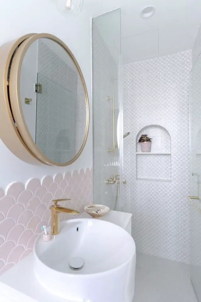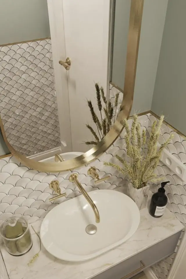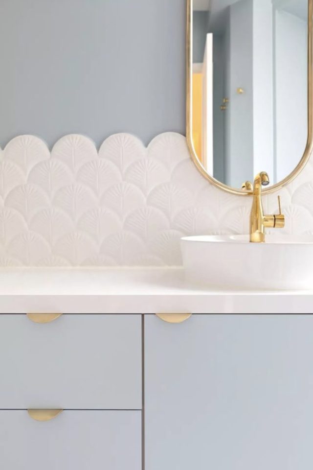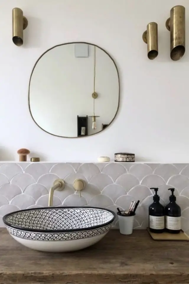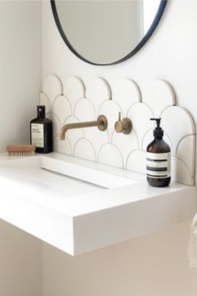 Changement de décor, on passe à la salle de bain. Il y a quelques semaines, j'avais eu un message privé sur Facebook où l'on me demandait où trouver du carrelage écaille pour créer une crédence de salle de bain. Il faut savoir que je ne réponds jamais à ce genre de messages sur les réseaux sociaux (parce si j'ai la référence, je la mets sur le blog, si elle n'y est pas, c'est que je ne l'ai pas!) Cette fois, j'ai des références à vous donner et donc c'est l'occasion de vous proposer de nouvelles images inspirantes pour votre salle de bain.