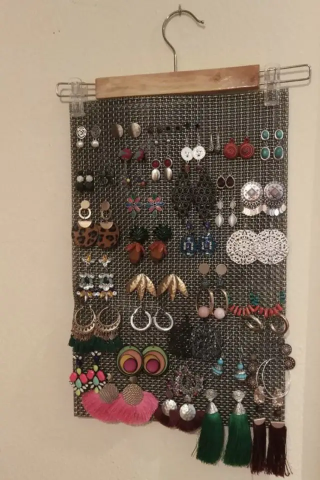 - Un rangement à bijoux que l'on suspend au mur (et les bijoux deviennent un élément de votre déco);