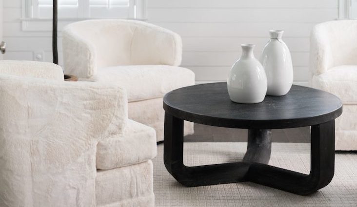 11 • Même si souvent la table basse est en bois, ce n'est pas le seul matériau possible. Dans ce onzième salon, on a une table plus design en verre avec une forme organique. Au centre de la table, un vase posé sur un petit plateau rectangulaire et quelques bougies. Le plateau permet de démarquer la déco posée de la table mais aussi du tapis qui se voit grâce à la transparence du verre.
