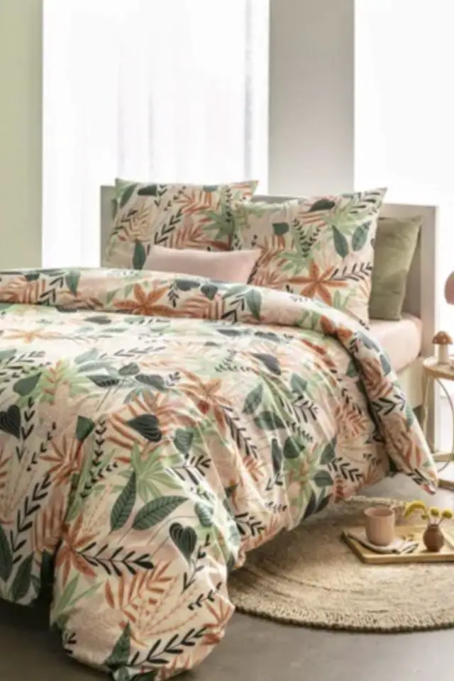 Je ne suis pas une grande fan du motif feuilles d'arbres qui tombent quand il est question de linge de lit. J'aime beaucoup l'uni et de la couleur quitte à mixer les différentes parures entre elles, dépareiller la housse de couette des taies d'oreiller. Comme je sais que parmi mes lectrices fidèles il y a des adeptes du motif, j'ai tout de même cherché des parures dans cette veine.