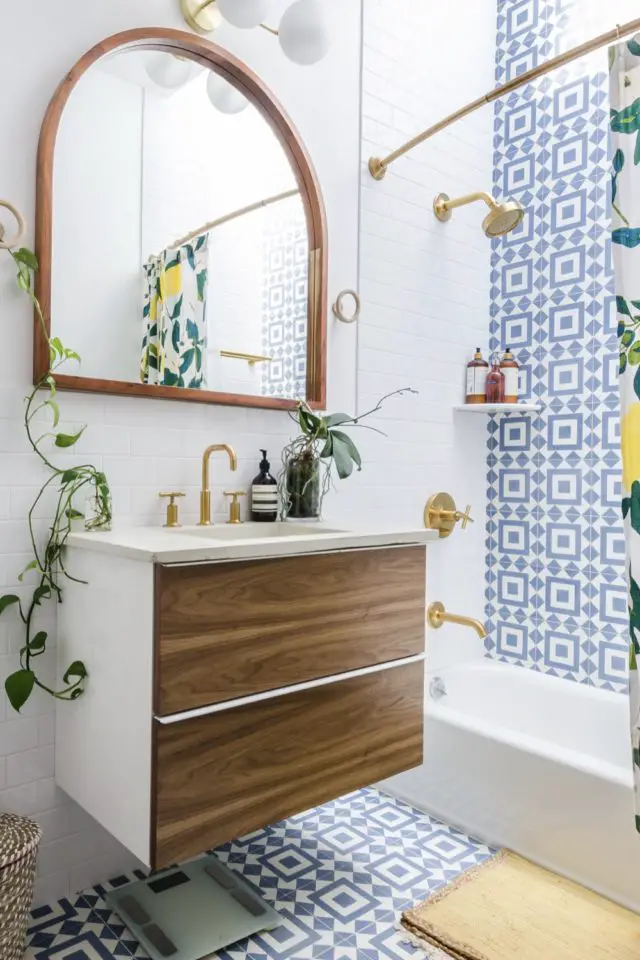 Une alternative au bois: le carreau de ciment. Ses motifs surannés apportent beaucoup de charme même à une petite pièce d'eau mais aussi une touche de couleurs. Pour accentuer le côté cocon de la pièce, on évitera les motifs bleus et gris (un peu trop froids) et on privilégiera les teintes plus chaleureuses comme le rouge, le bordeaux, le jaune moutarde par exemple. Les carreaux de ciment trouvent aussi bien leur place au sol comme au mur!