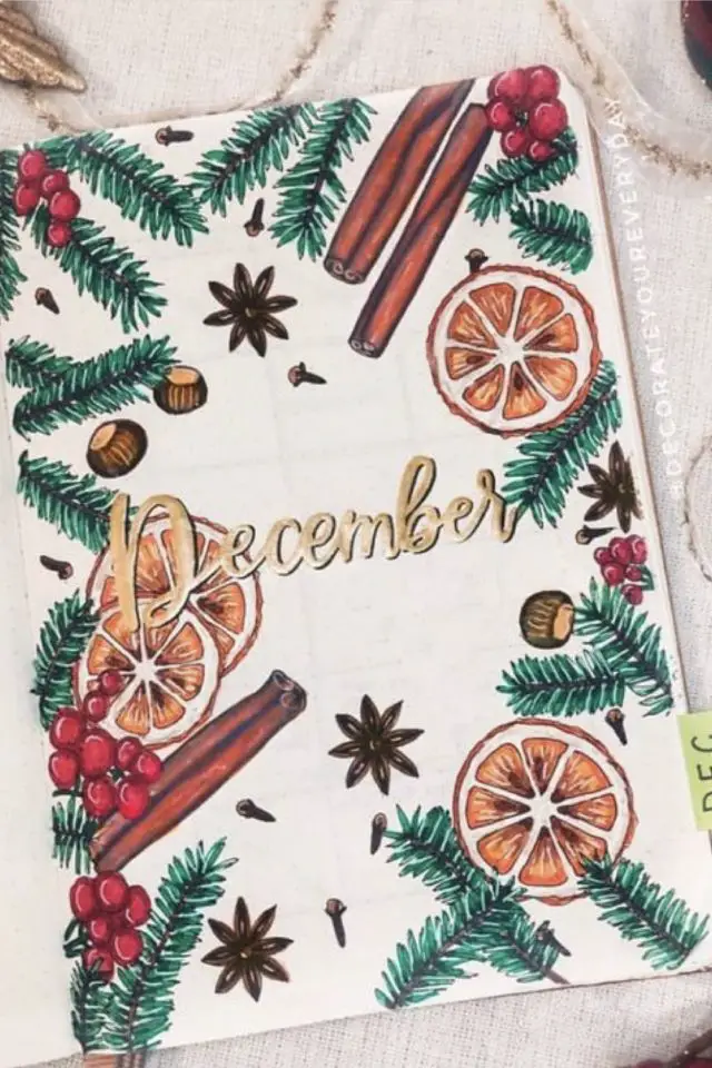 Noël est une période de l'année qui est assez facile à reproduire dans le bullet journal. Depuis notre enfance on baigne dans les symboles relatifs aux fêtes, on les connait donc très bien. On aura des éléments naturels comme le sapin, les pommes de pins, les flocons de neiges, le houx et le gui... Il y a aussi les objets propres à Noël comme les cadeaux, les chaussettes, les décorations (les boules et les guirlandes ou encore la couronne de Noël à suspendre aussi bien en intérieur qu'en extérieur). Dans le même esprit, on peut aussi évoquer le rouge, le blanc et le vert qui restent des valeurs sûres et traditionnelles pour décorer votre mois de décembre. Noël peut aussi être gourmand avec ses maisons en pin d'épices, son vin chaud dégusté sur le marché de noël, les chocolats... et j'en passe. Bref, les inspirations sont nombreuses pour donner des tonalités festives à votre bullet journal en décembre!
