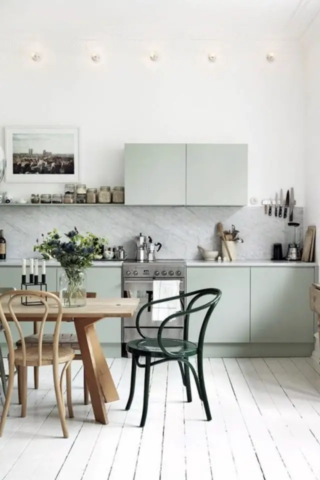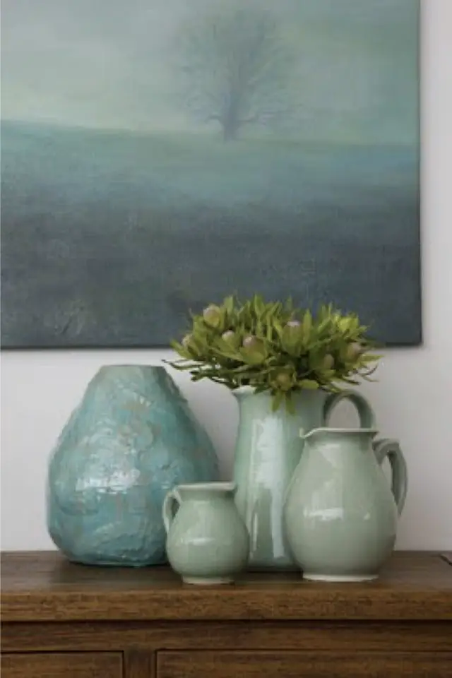 Autre facette du bien-être: la douceur grâce à la couleur. Si vous suivez le blog, vous savez que j'aime le vert et que c'est une couleur qui me fait du bien. J'ai besoin de douceur en ce moment, j'ai l'impression d'évoluer dans un monde qui ne me veut pas du bien (et pas seulement parce que je passe mon temps à me casser la figure en étant à jeun!) Et donc pour répondre à ce besoin de délicatesse, quoi de mieux que le vert céladon. Plus clair que le vert sauge même si lui aussi est emprunt de gris et de tendresse. Le céladon trouve sa place de différentes manières. A dose homéopathique, avec des objets décoratifs comme des vases posés sur le buffet. Si ce n'est pas suffisant, le mobilier ou les murs peuvent se couvrir de cette couleur pour vous envelopper. Je m'imagine facilement rentrer chez moi et évoluer dans un tel univers. Ressentir cette possibilité de me détendre.