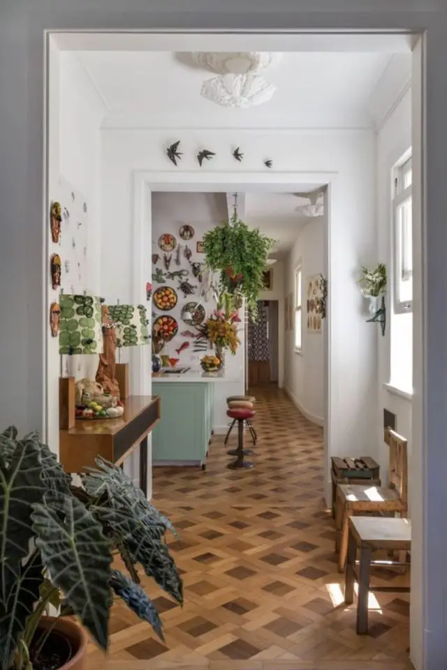 Ma semaine ici commence un peu en retard. Une nouvelle fois, je change de pays et cela demande un peu de temps. Hier il fallait faire nos tests, quelques courses avant de partir. Quand on est rentré en début de soirée, avec la chaleur et parce qu'on fait tout à pied, j'étais complètement rincée. Aujourd'hui, mon programme est plus soft, je dois faire mon sac et quelques courses et faire du change uniquement. Et demain (enfin cette nuit), c'est le départ. On retourne au Laos. Retour au calme et au vert. Même si ça ne fait que 15 jours que nous sommes en ville, ça va faire du bien de repartir dans un endroit où la nature est omniprésente. Enfin bref, j'espère que les prochaines semaines me laisseront le temps d'écrire plus longuement à propos de voyage, ça fait trèèèèès longtemps que je n'ai pas consacré d'articles à ce propos. En attendant, aujourd'hui, il est question de décoration. Une nouvelle semaine, une nouvelle dose d'inspirations pour un quotidien déco. Et pour une fois, cette semaine, il ne va pas être question d'une pièce particulière, ce sont 4 points déco qui ne sont pas spécifiques à une pièce que j'ai eu envie de traiter. Il va être question de maximalisme & de motifs, de déco au dessus d'un meuble que j'aime bien, de décoration avec du verre coloré et avant cela, on commence avec le parquet et des poses qui sortent de l'ordinaire. Je vous souhaite une bonne lecture, une jolie semaine.