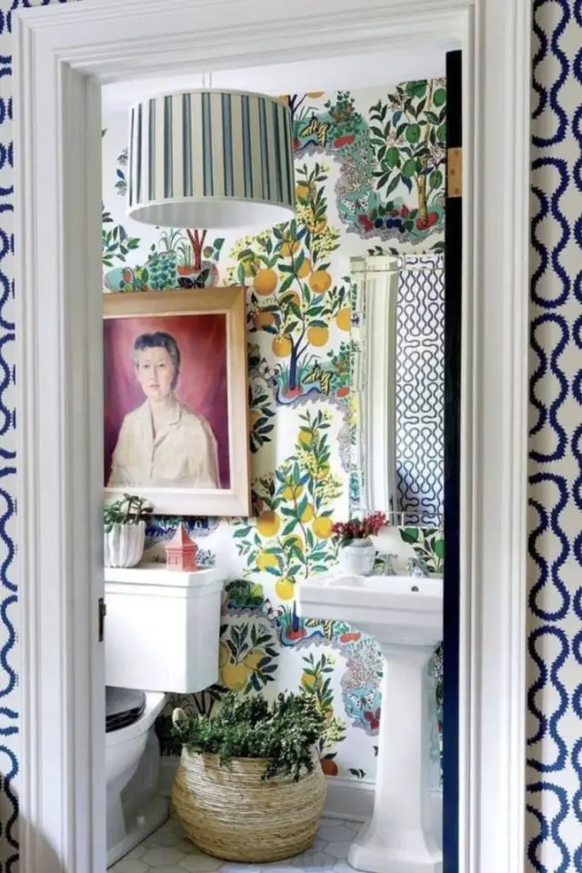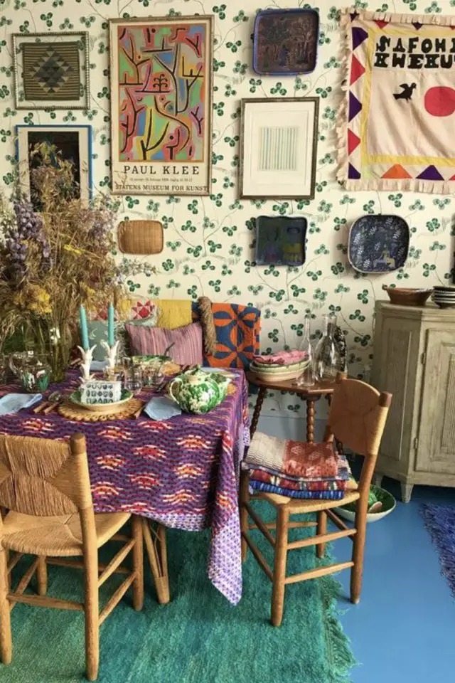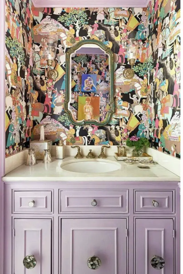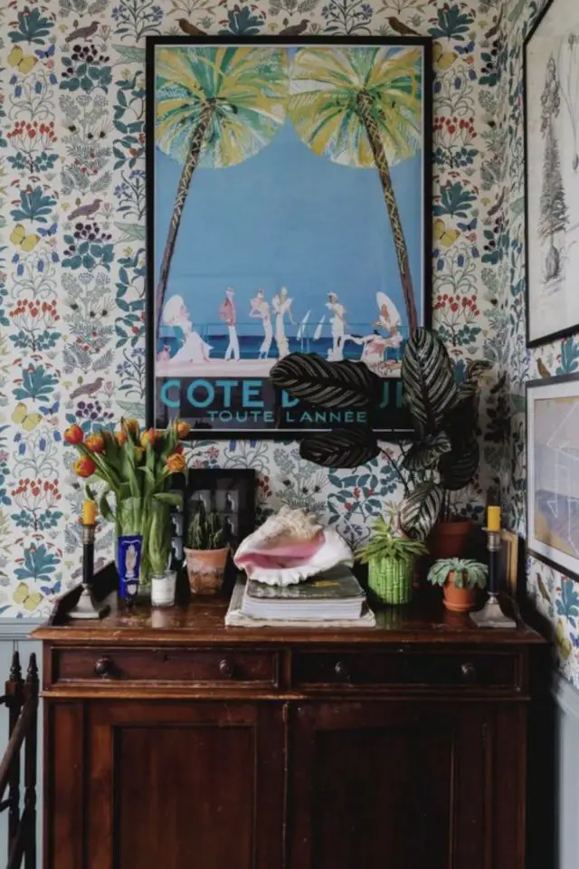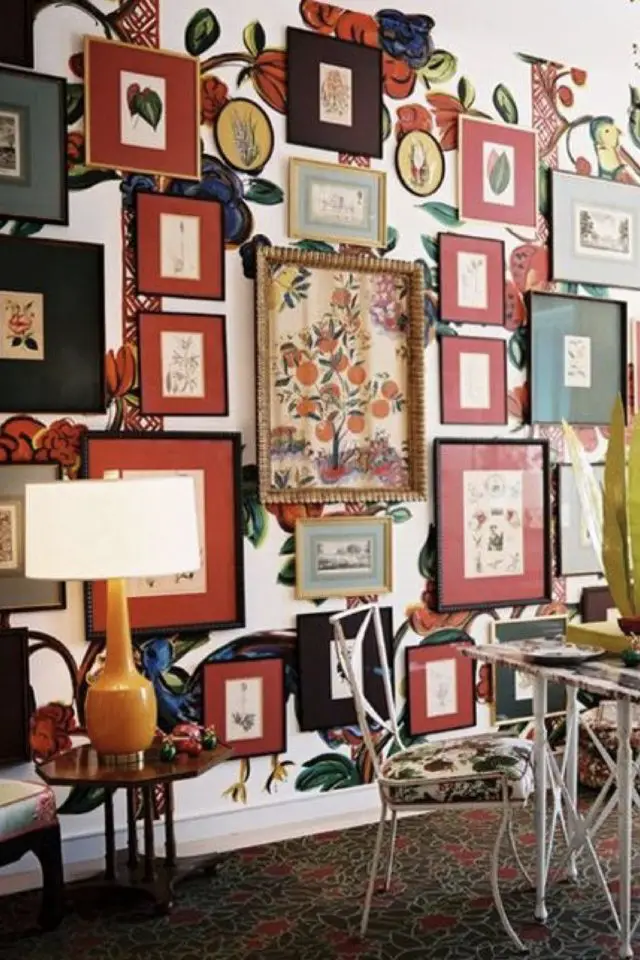 Et je termine cette sélection hebdomadaire avec du papier à motifs associé à d'autres éléments décoratifs comme des cadres, miroirs, appliques murales, tapisseries à suspendre... Il y a ici clairement une idée de maximalisme. Et même si j'apprécie la sélection que je vous propose, je ne m'imagine pas du tout vivre entourée d'autant de détails. Je crois que j'aurais du mal à me vider la tête avec autant. Et vous, cela vous inspire quoi? Vous vous imaginez facilement vivre avec un tel décor mural?