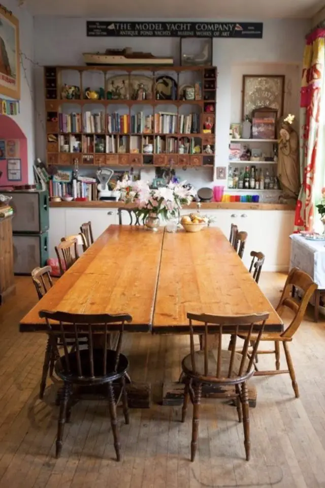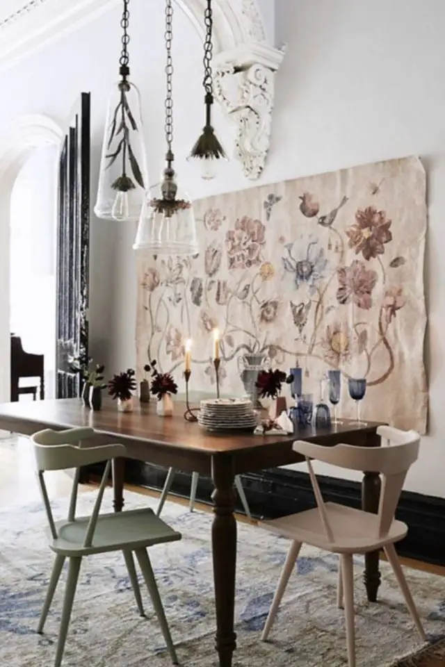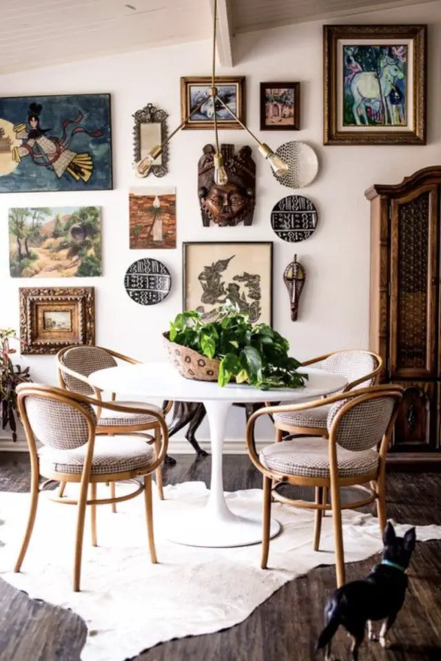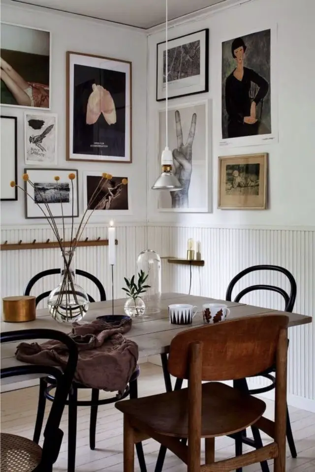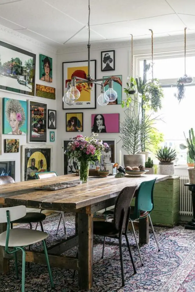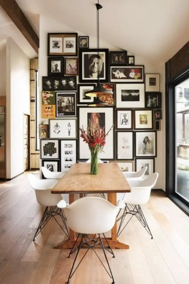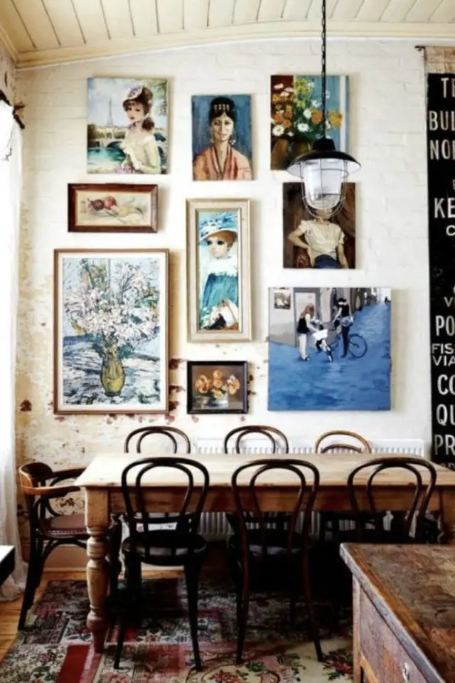 - Le décor mural est souvent travaillé et créer sous forme de patchwork de cadres, tableaux, affiches, photos... Sur un mur ou plusieurs, au dessus du buffet ou pas du tout.