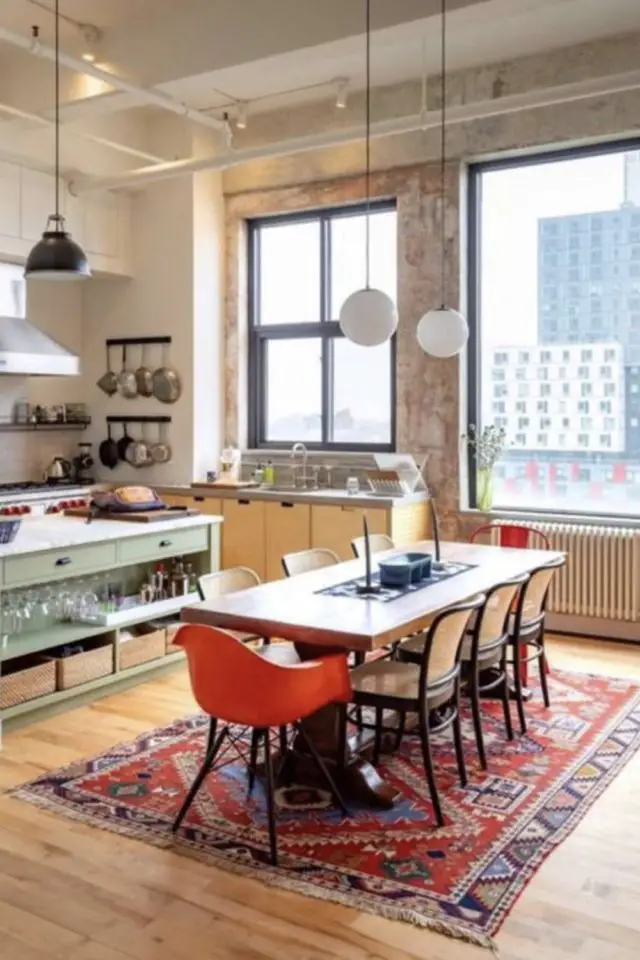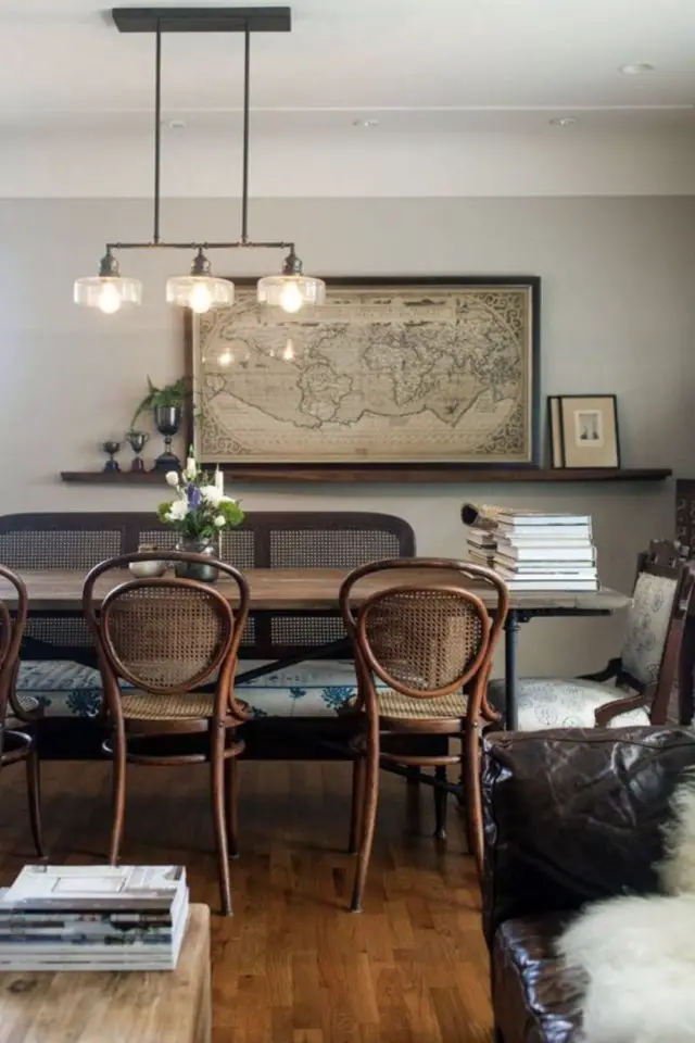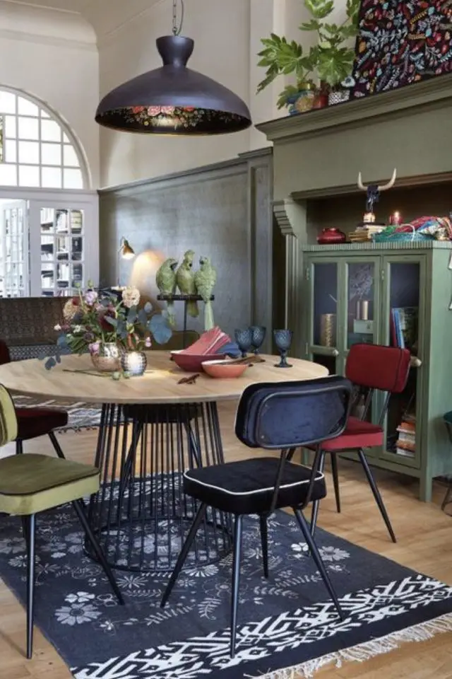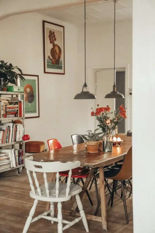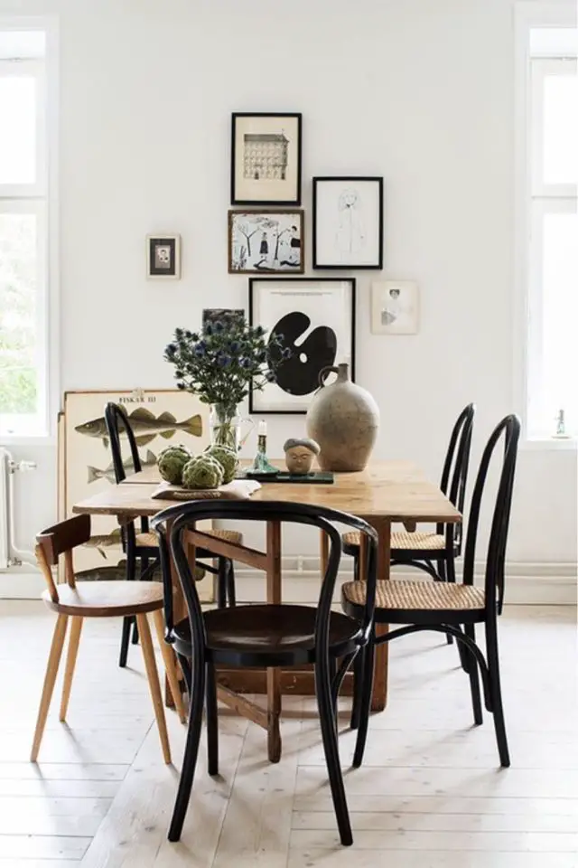 - Les chaises dépareillées dont elles aussi souvent présentes dans les salles à manger éclectiques. On va jouer sur la forme et le design comme la couleur des chaises. On peut aussi associer des chaises à un banc ou une banquette.