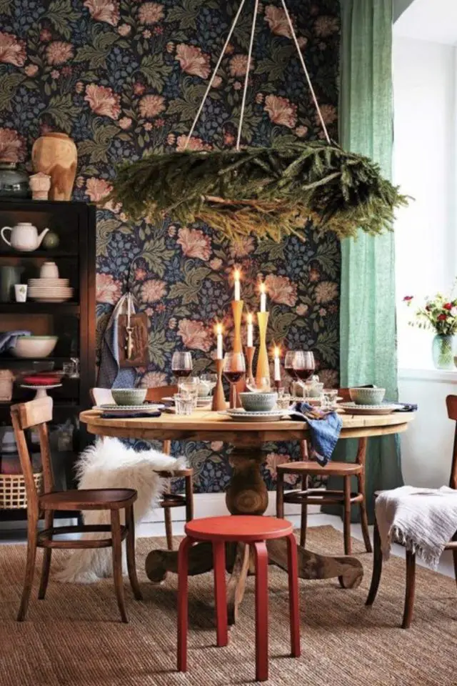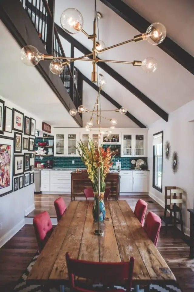 - Un luminaire étonnant, inattendu est aussi une piste pour créer ce type de décor. Cela peut être une suspension taille XXL ou encore un lustre rétro chiné chez un antiquaire. Il a une place centrale puisqu'il ce trouve au dessus de la table, il est donc une composante essentielle de votre déco.