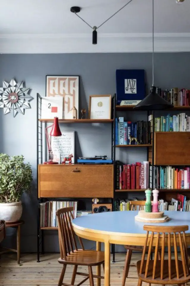 - Une bibliothèque à la place du traditionnel buffet pour créer à nouveau un sentiment d'étonnement quand on entre dans la pièce. (La bibliothèque peut très bien être fermée par des portes sur la partie inférieure pour vous permettre de ranger de la vaisselle...)
