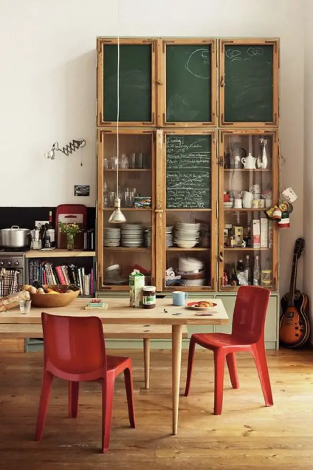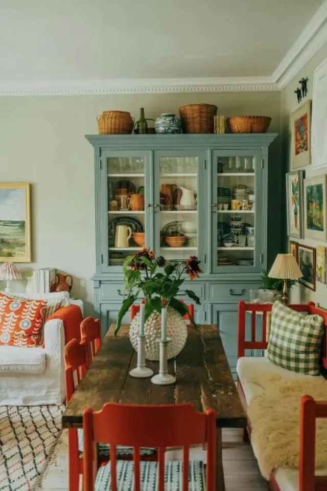 - Et il y a aussi une idée de maximalisme, de multiplication des objets. Pour décorer la salle à manger, cela peut prendre forme dans une vitrine par exemple et donnera un petit effet brocante à votre espace.