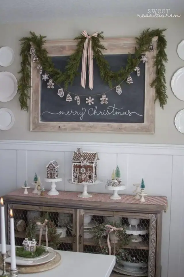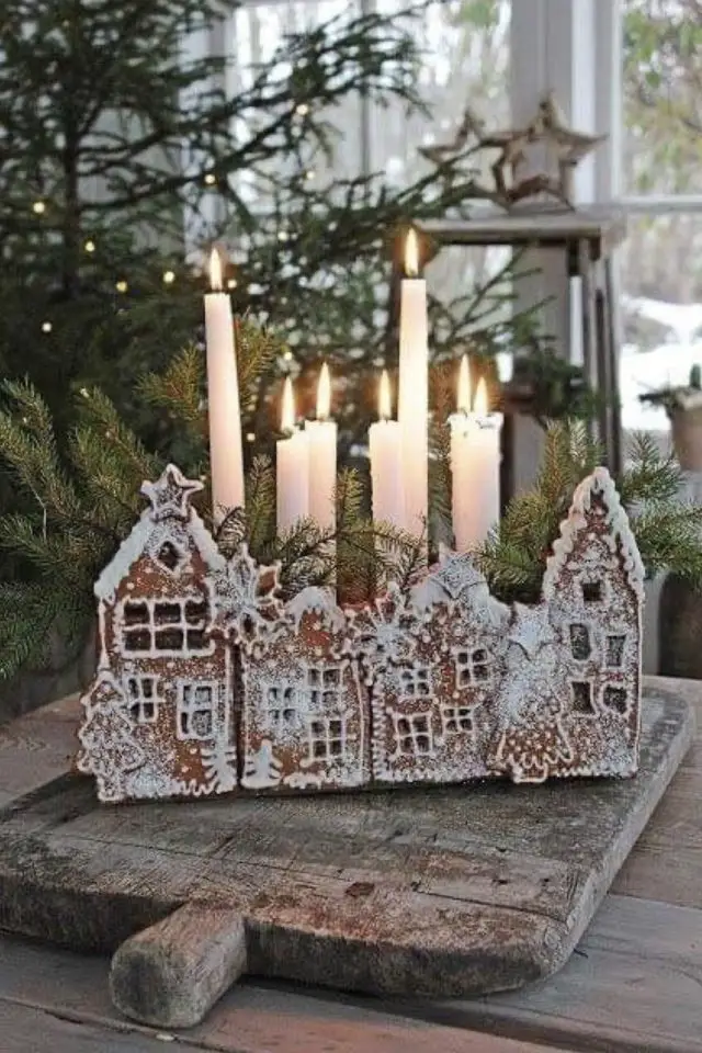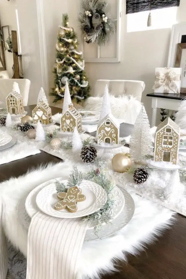 La déco de noël gourmande en pain d'épice peut être la base de votre décoration de table. Cela change des éternelles buches de noël avec des bougies. Avec du tissu blanc (pour créer un manteau neigeux), quelques petits sapins, des pommes de pin et des maisonnettes, on crée facilement un village en guise de chemin de table.